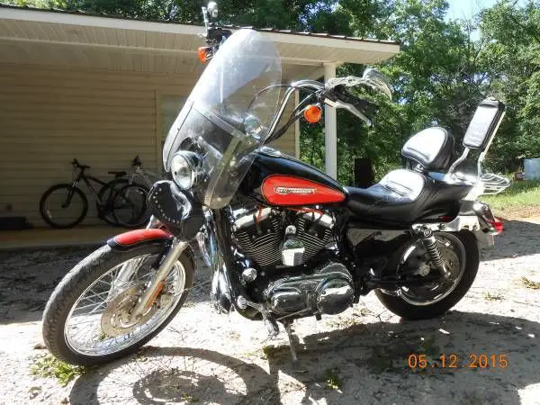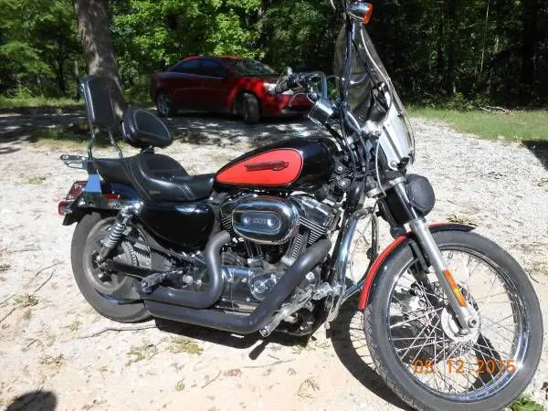 Up for sale is a 2009 Harley 1200 Sportster Model 20C. Bike runs great and is in great condition. Harley orange and black. Quick detach windshield with storage bag behind it and another on front shocks. Has backrest for both driver and passenger that are also detachable. Has blacked out Vance and Hines pipes added. I also have the factory sportster seat as it has a custom seat on it. This bike has been to Sturgis and lots of local rallies. Bike is going to need tires soon. It has been ridden a lot but well taken care of! Stored indoors. Please feel free to ask questions if you have any. Title in hand for a quick deal. I prefer cash transactions but if you do a cashiers check it has to be during business hours and meet at bank so they can verify the funds and validity of check. Also is direct injected and has tear drop mirrors and sissy bars.