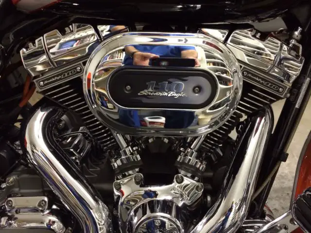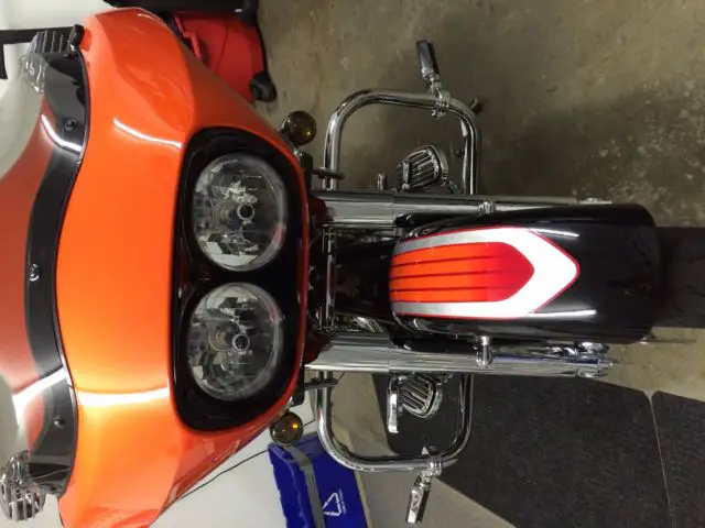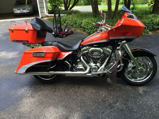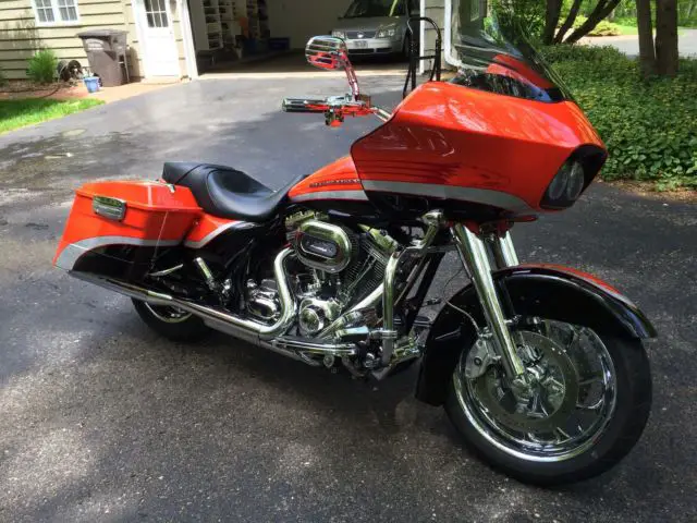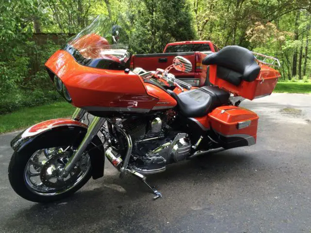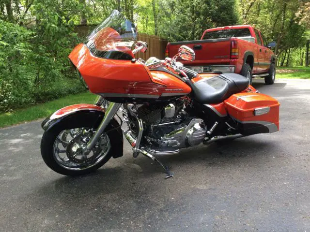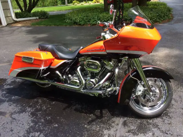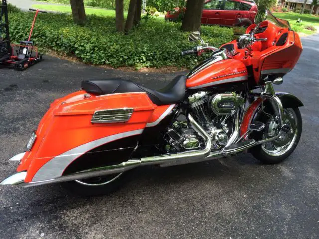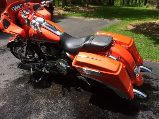 2009 Road Glide CVO Screamin Eagle electric orange in showroom condition. Don't let miles fool you. This bike looks like it has no more than 5000 miles.Second owner and both have kept bike in pristine condition. One flaw in tank and I did not notice it until a month after purchase. Will not show up on a picture as it has to be in the light just right to see. Extras include cloth HD lowers highway pegs Vanc n Hines downturn exhaust Hog Tunes amp and speaker upgrade King Tour Pak in Orange and CVO backrest both with quick detach kits. Comes with the saddle bag removable soft packs and saddle bag inner lid organizers. Tires around half or so. 20000 dealer service done at around 24000 mi. 110 motor security system 6 gal tank chrome wheels battery tender tether. It's a CVO and if you are looking for this particular bike you know how they come from factory so I won't bore you any further. Bike absolutely is a head turner and in excellent condition. It's in Green Bay WI and buyer will need to arrange shipping. Buyer reserves right to end auction early as bike is for sale locally.