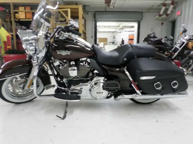 Harley-Davidson FLHRC Road King Classic Model Highlights NEW PowerPak setup with large 1690 cc Twin Cam 103™ engine Anti-lock Braking System (ABS) and Harley-Davidson® Smart Security System with hands-free fob NEW Sculpted seat for added comfort and easier straddling NEW Tank medallion styling NEW Paint color options NEW Black powder-coated powertrain with chrome covers o Chrome 2-1-2 dual exhaust with slash-up end caps o Chrome Laced Steel wheels with wide-whitewall tires o Chrome nostalgic fuel tank console with electronic speedometer o Deep FL front fender with trim o Clean rear fender with deluxe trim o Stainless steel ergonomic handlebar o One-piece two-up Road King® seat with tooled leather trim and chrome accents o Clear large Lexan® quick-release detachable windshield o Tooled leather-wrapped hard saddlebags; 1.85 cu. ft. volume o Large Hiawatha headlight and chrome nacelle o Auxiliary passing lights o Electronic cruise control