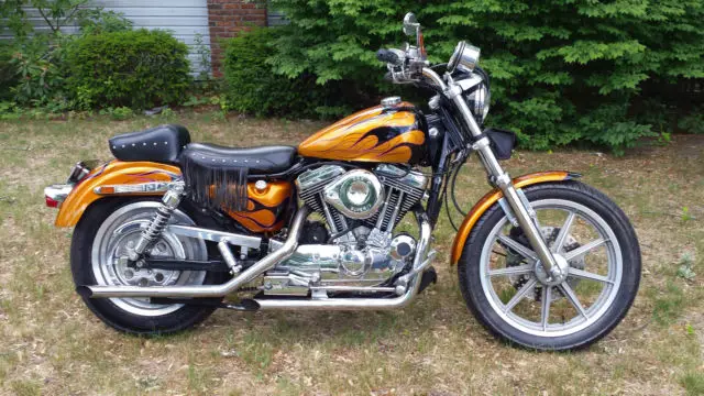Up for sale is my Custom and chromed out Harley Sportster. The motor was Upgradedto a 1200whenmy Brother in law purchased it. He then had Suffolk Harley in Oakdale NY do the top end and rebuild it using Screaming Eagle and performance parts. We figure it is bigger than a 78 cubic inch power plant now. All the motor work was done at about 20 thousand miles and the bike only has 25k now. He owned it for five years and I bought it from him eight years ago. It has a new front tire with less than a thousand miles on it and the rear has about 3K. The bike has been maintained by Back Street cycles and their mechanics since I own it. Fluids are changed regularly and this bike is very reliable it never let me down! It has a Sport Bob tank (small spot pealed by left gas fill when it sat with an overfull tank one winter. see pic) I put a vinyl flame over it and it has more chrome than most Sporty's will ever get. Paint is a custom Acura color and all the parts are flamed and pinstriped. It has forward controls so it is comfortable for a taller rider. Bike is fast and loud with an S&S super E carb and straight pipes that I have brand new baffles for. I am giving any extras with it like a solo saddle and anything else related to this bike. I am starting at a reasonable price and selling with NO RESERVE ! Only bid if you have the funds and don't need permission to buy it.Thanks for looking.