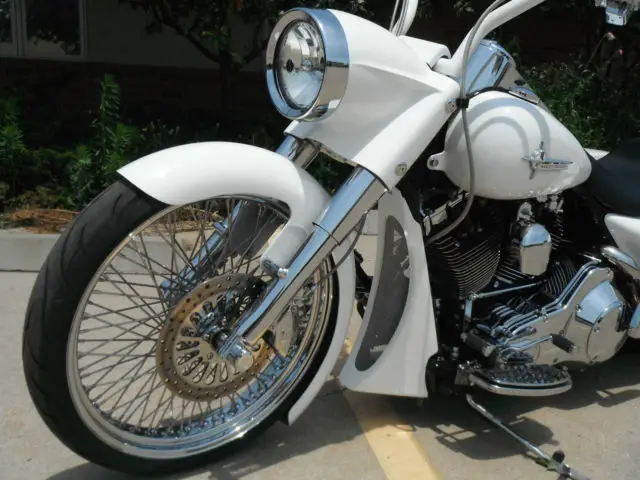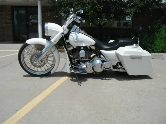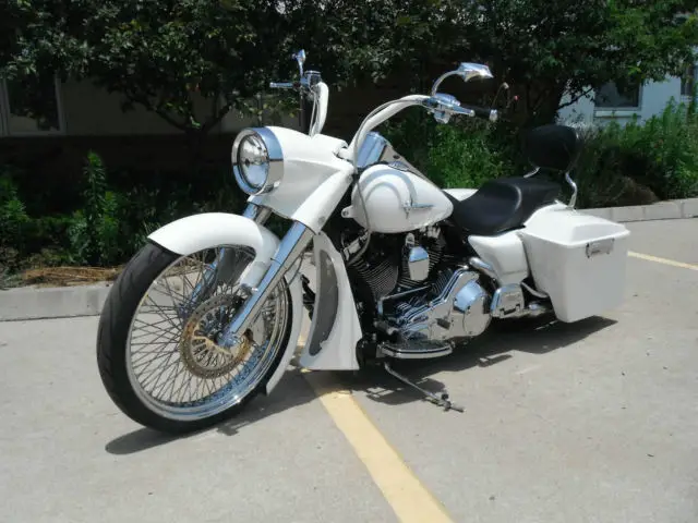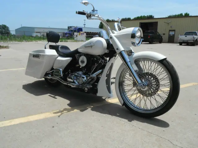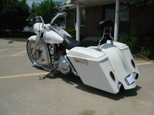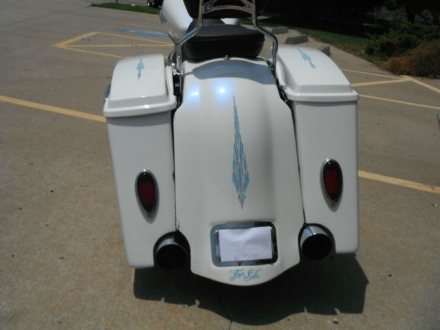Up for auction is one badass gorgeous custom bagger just in time for your local bike night! Some of the best in the Kansas City area built tuned and painted this bike. Raked triple trees 23" chrome spoked front wheel with chrome HD caliper and rotor extended painted headlight nacelle custom bent one-off handlebars extended saddlebags adjustable rear air suspension and removeable backrest if you want the solo look. Custom white pearl paint that no camera can do justice the pearl really pops in the sunlight. 95" Thrasher kit with worked heads big camshaft manual compression release Mikuni carb and true dual exhaust. This bike rides and sounds as good as it looks! If you have any questions do not hesitate to ask! Call David @ (816) 520-0985 or Brian @ (913) 548-7861.Bike is available for inspection. Bike is for sale locally auction good end at anytime. Buyer is responsible for shipping or transportation. $500 deposit required within 48 hours of close of auction. Payment in full in 7 days from time of closing; cash wire transfer verifiable personal check or cashiers check. Kansas resident must pay sales tax.