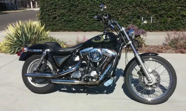 I bought this sweet FXLR new from Marty at Chicago Harley-Davidson in summer of '93. In California since '99. Road trips include San Francisco to Chicago and Chicago to New Orleans. Custom paint Mojave rattlesnake - deadliest of the breed. Rare metal side covers. Tasty Ness mirrors. Tank pinstriping by Joe Martin of Martin Bros. Comes with four seats including new leather Corbin, nake-patterned leather Gunfighter, lso original vinyl seat and pillion. Screaming Eagle carb. Python pipes. Original matching numbers engine. Detachable windshield (nice item off Deuce, its perfectly). Custom saddlebags and fork bag from Kelly's Leathers in Richmond Illinois. Carbs recently expertly rebuilt at HD Glendale. Runs perfectly. Only blemish is typical small paint peeling off trans.