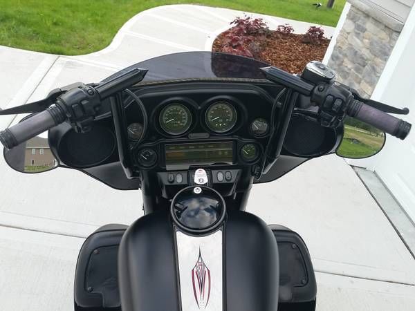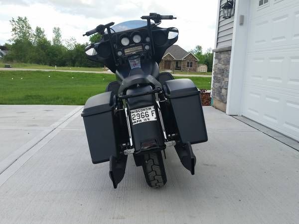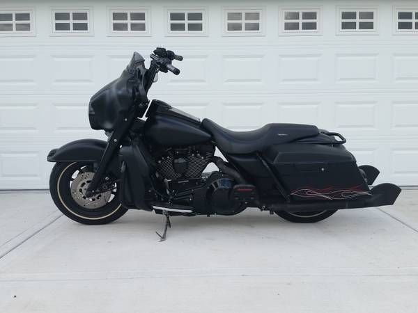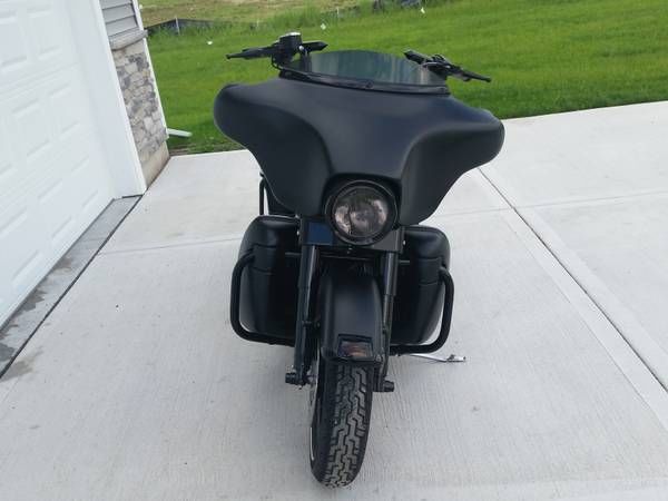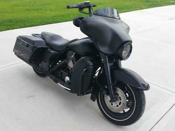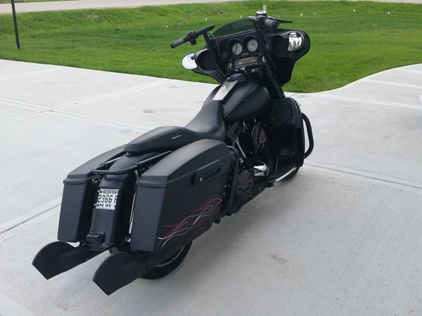 This is a 1997 Harley Davidson Electra Glide converted into a Street Glide with just over 46k miles. It is professionally custom painted flat black with pinstriped red and white flames on the boxes. Almost all the chrome has been powder coated gloss black. It is lowered, ustom fabricated rear fender with embedded license plate. Custom led rear tail lights and turn signals. Custom spiked apes for handle bars with black diamond cables. Exhaust is wrapped and ceramic coated. It runs great. Clutch was replaced about 1k ago.