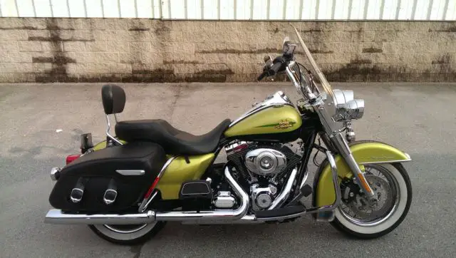 2011 HARLEY DAVIDSON ROAD KING CANDY APPLE GREEN AND BLACK COLOR, BS, 03 MOTOR, ECURITY, N IS A 1 OWNER BIKE ONLY 4708 MILES!! THIS BIKE IS A PRETTY NICE BIKE IT DOES HAVE A FEW SCRATCHS AN WEAR SPOTS BUT OVERALL ID HAVE TO RATE IT A 8.5 OUT OF 10. BIKE ALSO COMES WITH PASSENGER BACKREST AN MOUNTS FOR TOUR PAC AS YOU CAN SEE IN PICS. THE HANDLEBARS ARE AFTERMARKET AS WELL ALL THE WIRING IS INTERNAL EXCEPT FOR CLUT CABLE AN BRAKE LINES. PLEASE LOOK AT ALL THE PICS YOU WILL SEE ALL THE DAMAGED SPOTS. THE WORSE SPOT I BELIVE IS THE LEFT SIDE SADDLE BAG WHICH LOOKS TO ME LIKE A CAT HAS SCRATCHED IT WITH ITS CLAWS OTHER THAN THAT ALL OTHER SPOTS LOOK LIKE NORMAL WEAR. THERE IS A SCRATCH ON THE FRONT FENDER THAT IS ABOUT 1 IN LONG AS YOU CAN SEE IN PICS. I HAVE THIS BIKE LISTED LOCALLY AN CAN BE SOLD AT ANYTIME. I ALSO HAVE CLEAN TITLE IN MY HAND READY FOR NEW OWNER. PLEASE CONTACT ME FOR ANY FURTHER QUESTIONS AT 615-498-0903.