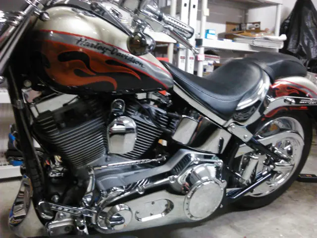 - 2006 Screamin' Eagle Fat Boy- 6100 miles- 103ci Screamin' Eagle factory motor- navy blue, ed, utumn haze, etal grind color scheme- excellent condition- includes removable windshield- includes removable back rest - luggage rack- flush mounted led fuel gauge and gas cap- includes optional rear seat with original chrome cap- battery tender plug in- led rear tail light