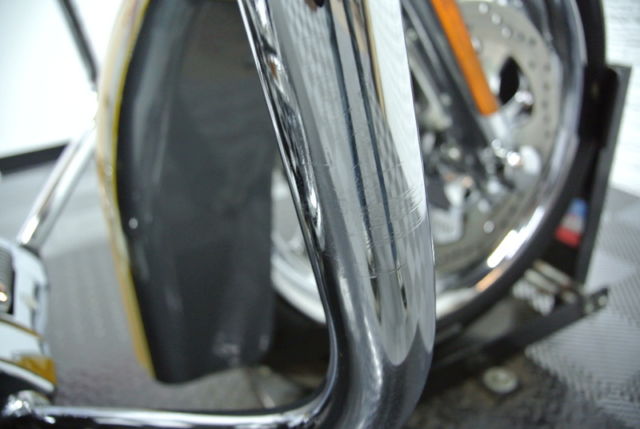 THERE ARE NO DENTS OR DINGS THAT I CAN FIND. THE IS A SMALL SCRATCH ON THE RIGHT SADDLEBAG. THE CHROME AND ALUMINUM ARE IN GOOD CONDITION WITH THE EXCEPTION OF THE TIP OF THE TANK BADGE IS MISSING (VERY MINOR, EE PIC). THE TIRES HAVE GOOD TREAD LEFT ON THEM.