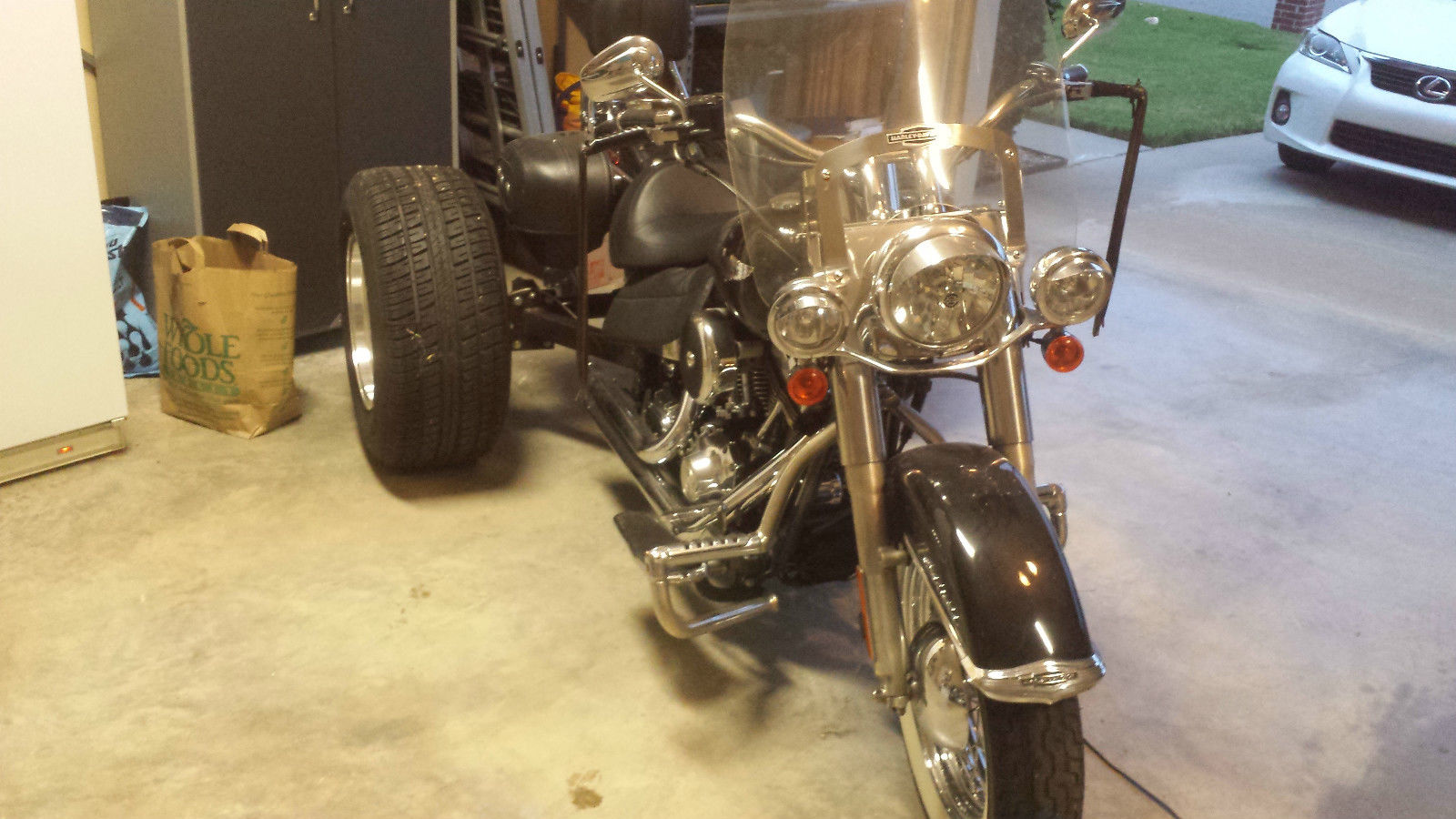 2005 Harley Softail Deluxe Trike Black in color. I have had the bike for 2 years now and only my grown son has ridden it. I have leg problems and thought the trike would help. The bike is financed so I will give you a bill of sale and when I get the title I will send it to you. The Bill of Sale will allow you to ride the bike without any worry. If you have any questions you can check with your local revenue. This is the way we do it in Arkansas. I have sold several motorcycles over the years on Ebay and have never had an issue. The bike runs great and the exhaust is new along with the $800 in back tires and rims. The seat is the Harley closer and lower seat. I do have the passenger seat and for a extra $125 I have the original seat. Thanks for looking and send questions if you have any.