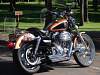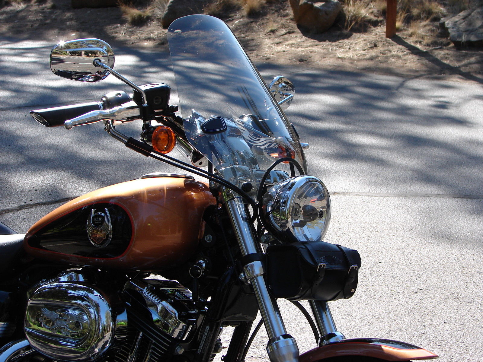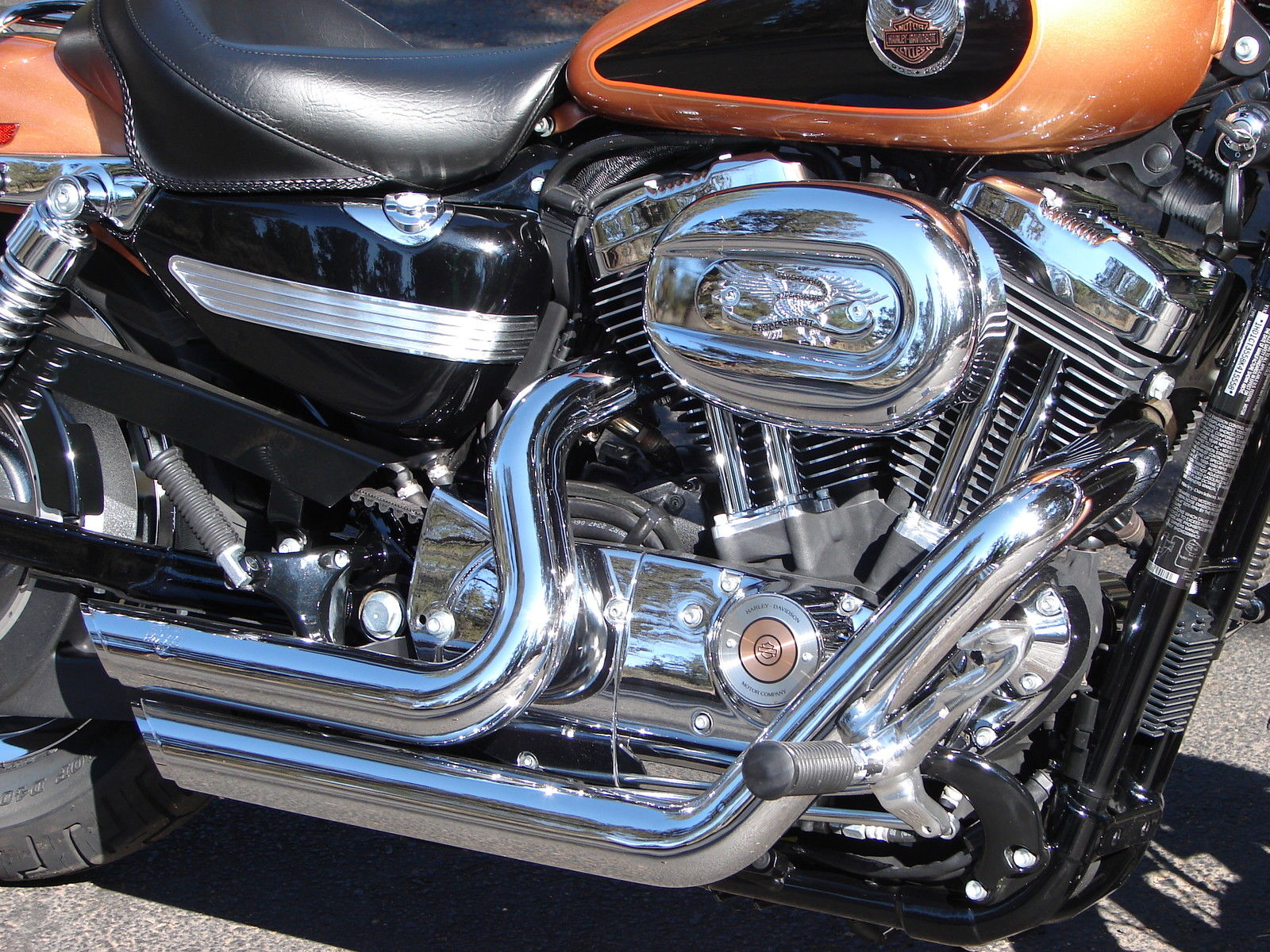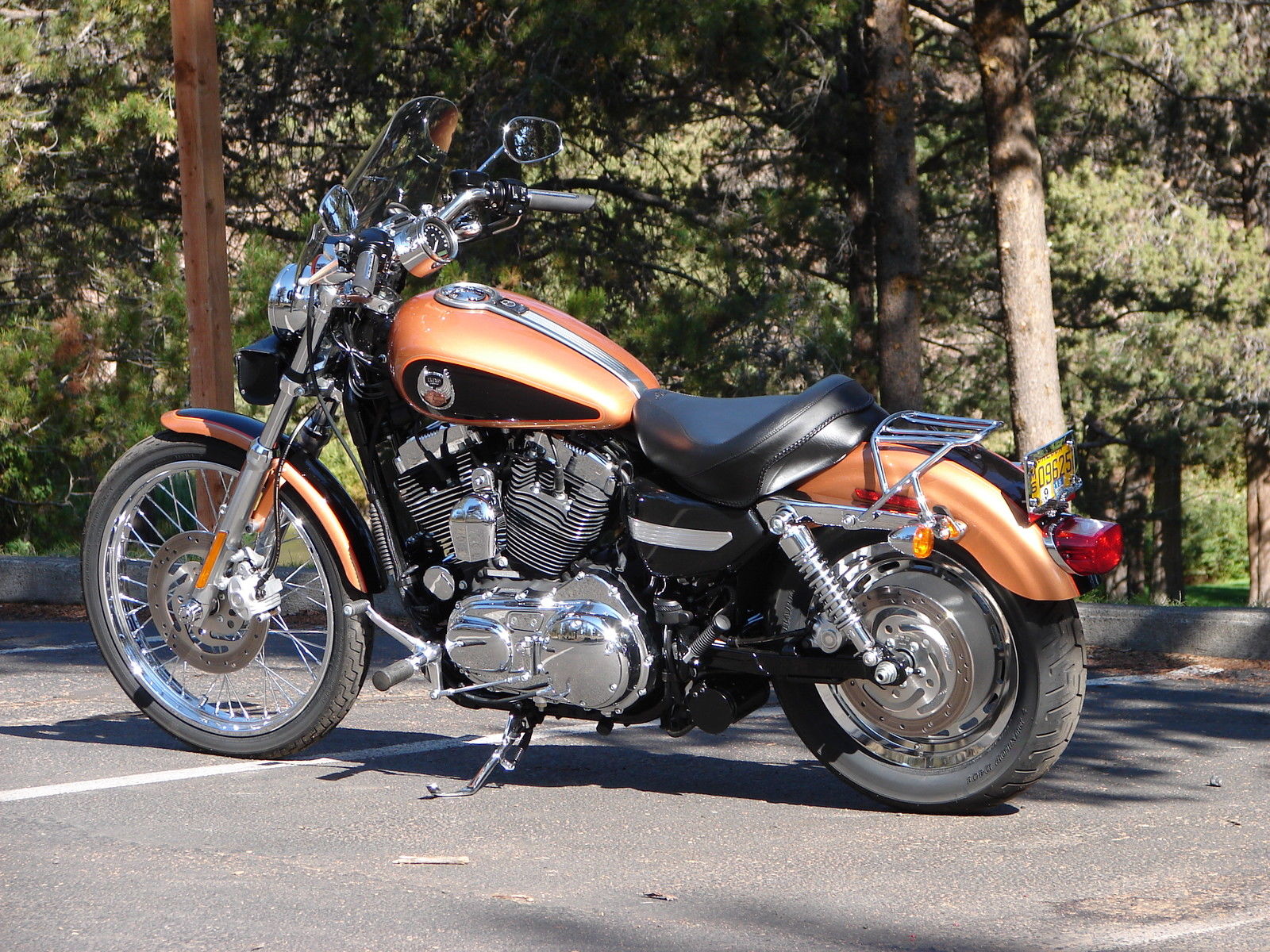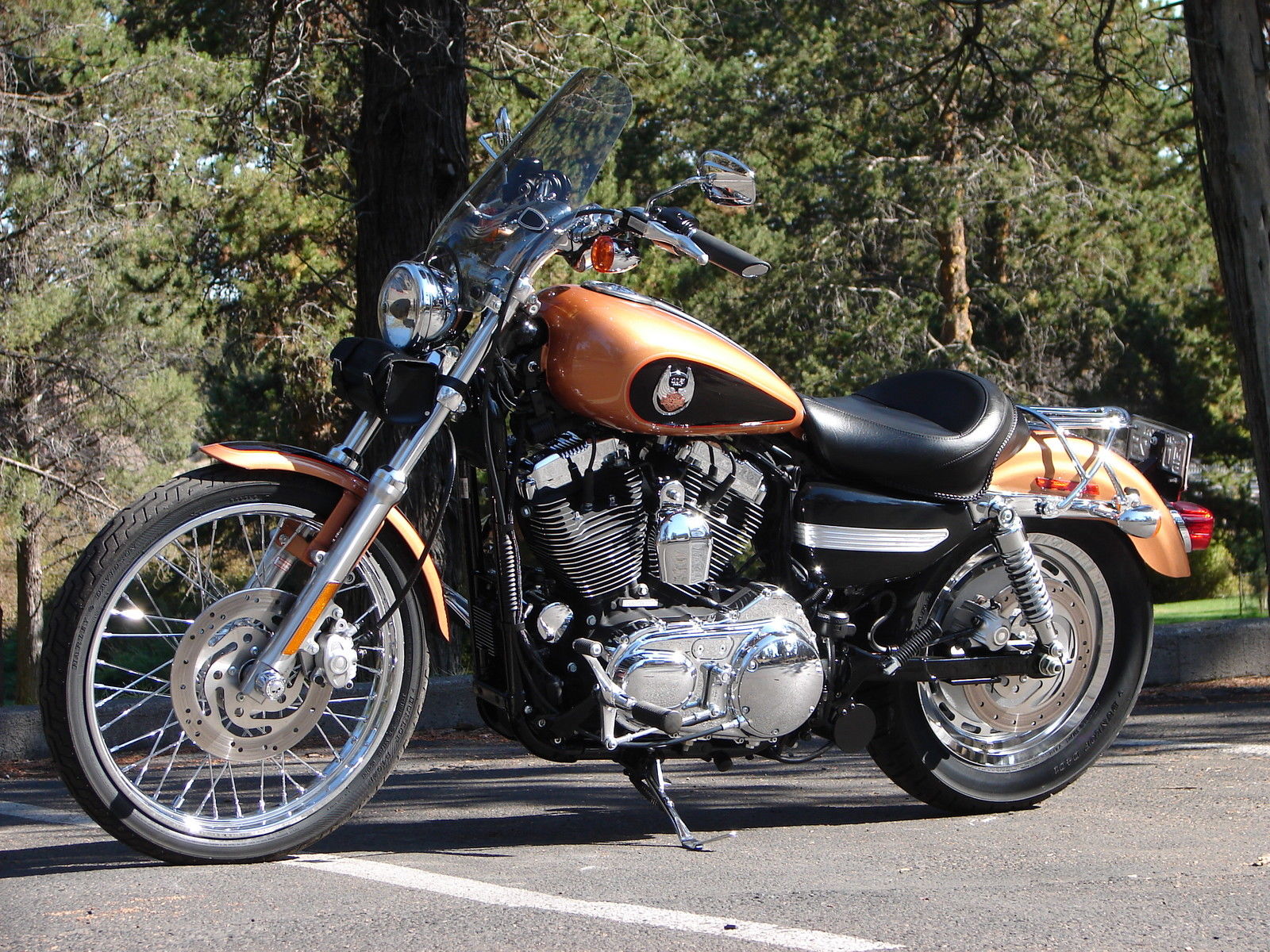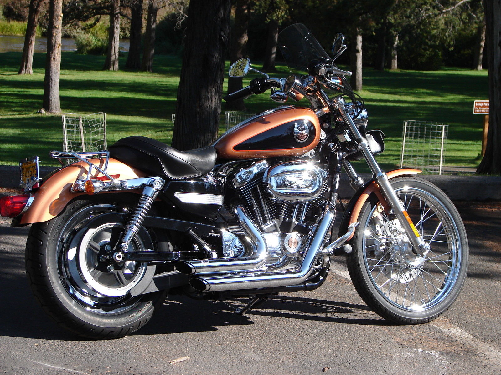 What makes a Harley a Harley? Is it just the sound of those two pistons pumping up and down. creating the unique rumble that is synonymous with the motorcycle culture? Perhaps it goes without saying that this particular motorcycle continues to be propelled by the old school. air-cooled 1200cc. Evolution engine that features electronic fuel injection and light. aluminum heads and cylinders. In terms of style this 105th Anniversary Sportster comes with black powder-coated cylinders. an abundance of chrome. a sweet new style fuel tank (four and a half gallons!) and chrome bullet headlight.  The HD Windshield offers up nice wind protection.  Custom touches are all over this scoot. the Aileron Hand Grips and the tricked Bar & Shield Gas Cap to name two.  She is also equipped with a Quick Release Chrome Luggage Rack to make it easy to strap a bag on her.  The stunning Copper and Black Paint job is perfect.  There is not so much as the smallest scratch or chip.  She truly shows as new.  It is rare to see a bike this meticulously cared for.  All services are up to date and the tires are new. less than 500 miles on both front and rear! The Vance and Hines exhaust has just the right amount of attitude. certainly way louder than the stock system. but not obnoxious or overpowering.  She is breathing easier with a "Big Sucker" intake and has been programed with the tuner kit from Harley.  The Solo Mustang seat is a very comfortable perch that makes long rides comfy and has a great look with the braided trim.  This is a cool. fun to ride machine that is ready to take her new owner anywhere they choose to go.  She is freshly serviced and is ready to ride.  The stock seat that matches the paint scheme. two tone Black and Copper Tone. is brand new in the bag. never been ridden on.