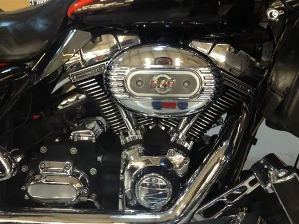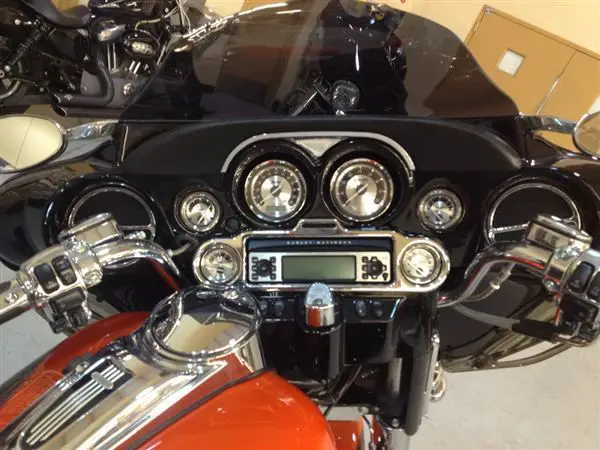 Styling / ConvenienceEngine Trim Black powder-coated with chrome treatmentExhaust System Chrome, -in. Touring cross-over dualswith chrome billet end capsHandlebars Chrome, -in. diameter internally wired bars;Ironside Collection heated handgrips w/chrome endcapsSeat One-piece, wo-up custom leather dualcontrol heated seat with adjustable riderbackrestFairing Fork-mounted ???bat-wing???Inner Fairing Color-matched with custom leather andchrome accented dash padLower Fairings Color-matched with adjustable ventsFairing Air Deflectors Lightly smoked fairing-mounted deflectorsGlovebox (2) inside fairing lowers w/ liners and coversInstruments Spun-aluminum, etal-faced w/ backlighting;electronic speedometer/tachometer, uelgauge, oltmeter, ow oil pressure gauge,sound system w/ handlebar controls,ambient air temperature gauge, dometerand resettable tripmeter, ruise controlStereo Premium system (40W per speaker) w/ AM/FM/CD MP3 player; XM Satellite Radio; navigationsystem, ront/rear speakers, mplifier, eatherband, lock, i-directional seek/scan, racksearch/scan, presets and automatic volumecontrol w/ adjustable sensitivityAuxilliary Audio Input On radio face; will accomodate anyline-level audio output deviceXM?® Satellite Radio 3-month trial of XM Satellite Radio serviceAntenna AM/FM/WB and CB antennasIntercom Push-to-talk or voice-activatedCB 4-watt, 0-channel electronically-tuned CB(prohibited in some countries) w/ passenger controlsHeadset/HeadsetReceptaclesDriver/passenger stereo receptacle (use restrictedin some states/countries), ingle headset includedCustom LeatherTour-Pak?®Luggage box style w/ custom leatherbraiding/stitching; LED interior light, uggagerack, assenger backrest; plush linerSaddlebags Injection-molded GTX?® with hinged lid,chrome cover trim/slant latches; plush linersRemovable Liners Removable saddlebag and Tour-Pak linersSaddlebag Filler Strips Color-matched saddlebag filler stripsLuggage/Fork Locks Saddlebag/Tour-Pak power locking systemwith barrel key; common with ignition keyGas Cap Chrome push-button fuel doorFront Lighting Custom passing lamp brackets w/ bullet-styleturn signals; smoked lenses w/ amber bulbsRear Lighting Bullet-style rear signals; chrome narrow barHazard Warning Integrated into turn signal controlsSmart Security System6 Next-generation hands-free security fob;operates based on proximity to vehicle;