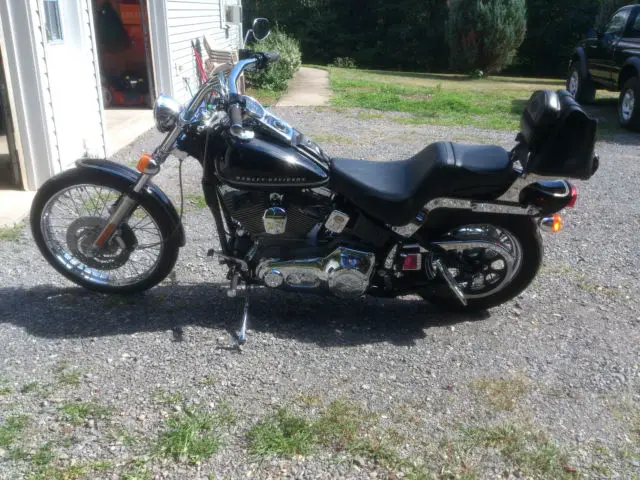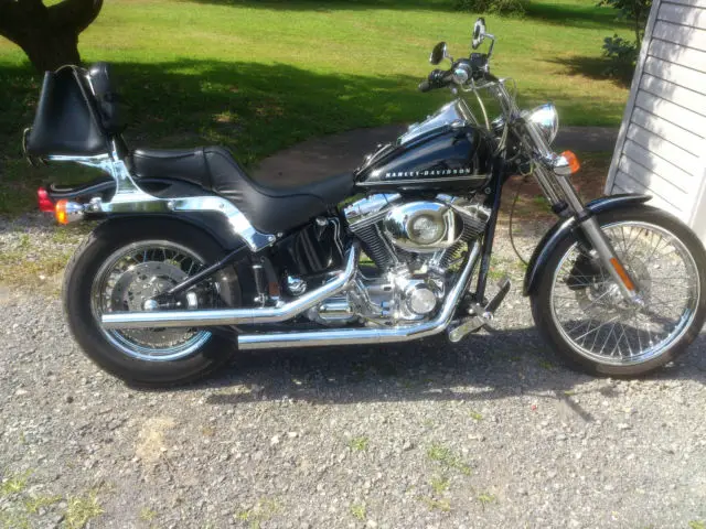 I have for sale a 2001 Harley Davidson Softail Std FXSTI 1450 cc motorcycle with 19205 miles in excellent condition. Bike has engine chrome kit. Harley logo items are as follows: Foamed hand grips, ront and rear chrome axle nut covers, as cap medallion, erby cover, nd chrome voltage regulator cover. Bikes comes equipped with Harley Davidson embossed messenger bag secured to chrome luggage/backrest. All of the cables have been replaced with stainless braided cables. Custom paint is black with silver painted pin striping and is clear coat finish. No ridges for stripes. Tank and fenders were removed for paint work. Paint is flawless and always looks like it is still wet! I have installed a Harley Nostalgic air cleaner cover over newly installed K & N velocity stack intake filter system. Along with intake a new Vance&Hines Fuelpak tuner was installed. Bikes exhaust flows through Vance & Hines straight shot staggered pipes with baffles. Chrome license plate holder has been installed on lower rear swing arm. Handlebars are 1 1/4 " chrome drag bars which are very comfortable. Last summer I had top end rebuilt because of small lifter noise. Parts replaced at that time were as follows: new rocker arm bushings, ew lifters, ew cam bearings, nd new ring set. Cylinders were deglazed and cross honed for rings to seat. I think about 1700 miles ago. Bike runs and sounds great. Bike can be displayed several different ways as windshield, ag, nd sissy bar are easily removed with no tools. I have Harley Davidson Softail manual that goes with bike. Bike is inspected until July 2016. Bike has all synthetic fluids.