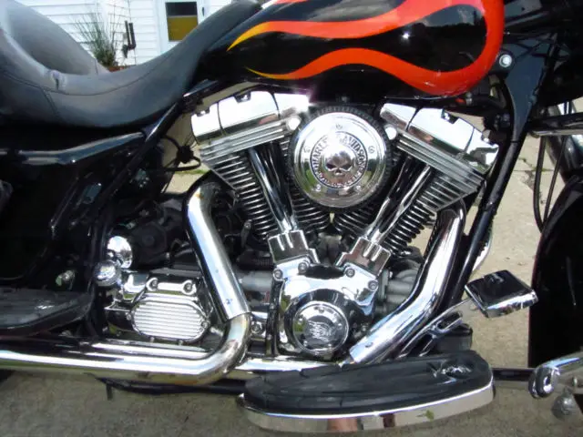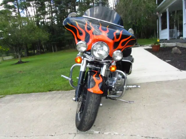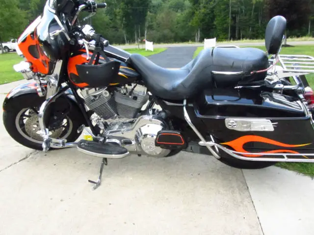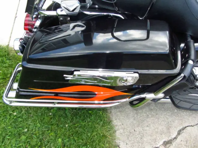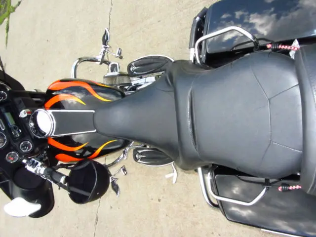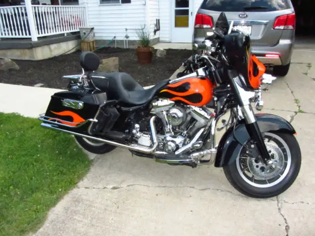 I am selling my first Harley. Several years ago I sold a Jeep and bought this bike as my wife would not ride the Honda NIghthawk I was currently riding... She has good taste. Now that we've been riding for a couple of years on this bike we know we enjoy it and it's time to upgrade to something newer, referably with less miles and a six speed. I paid $6,500 for this bike three years ago. I put a new back tire on it. Fixed an Oil leak in the primary ($1,200), ut a very nice Sony Radio and speakers in it ($600, as a hookup for an i-Phone or USB stick), ew battery, ED rear brake light and a couple of other goodies. Bike is in overall good condition and I ride it often, just want something newer. The flames aren't for everyone, nd I didn't think they were for me either, ut they kind of grow on you. The fuel gauge doesn't work, therwise everything else does. I ride it until it has about 120 miles on it and then get to a gas station. Full disclosure here, sk questions if you've got them. I'm not interested in trades, nless you have a newer street glide or Ultra and want some cash. Thanks for looking. Happy bidding.