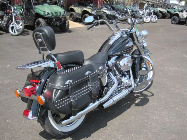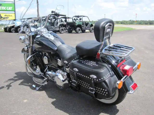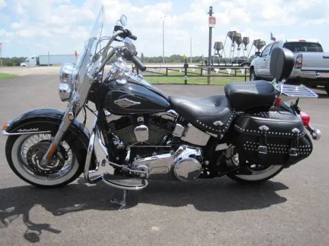 This 2011 Harley-Davidson® Heritage Softail® Classic motorcycle FLSTC is fully equipped with modern touring capabilities. Enjoy mile after mile of riding with a large capacity five-gallon Softail fuel tank. This Softail's tank is also dripping with authentic Harley-Davidson style. This Harley FLSTC has full length rider footboards with rubber vibration isolation for added comfort. Another of the many great features of this classic motorcycle is the detachable motorcycle windshield. You can remove the Harley Heritage Softail windshield for a new look. The 96ci fuel injected motor mated to the highly sought after 6 speed transmission makes for an awesome combination of power and fuel economy. The black tins are all in great shape, ith no dents, ings, r signs of damage. The seats are both extremely comfortable with no rips or tears in them. Already has a large sissy bar, indshield, hrome engine guard, hrome luggage rack, nd many other beautiful and functional accessories. The tires both have thousands of miles of tread left on them. Just buy it and ride it home...this Softail needs nothing! This is definitely a bike that you show off to your friends, uaranteed to turn heads. Feel free to give us a call at 979-733-8444 with any questions at all. Thanks for looking!