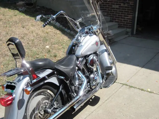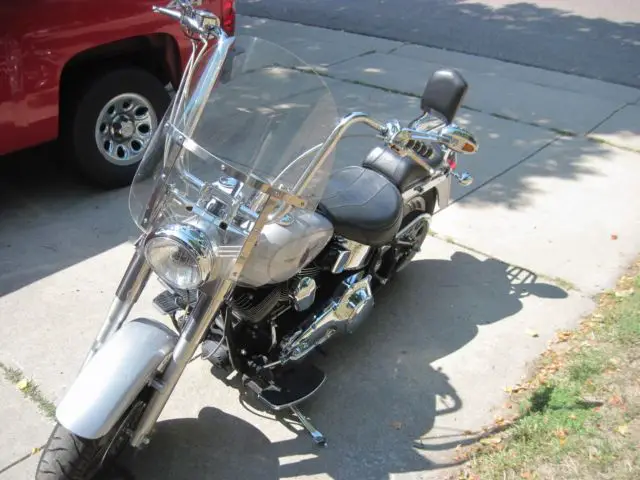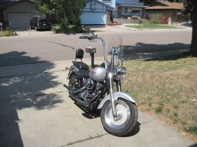 2002 FAT BOY....GREAT CONDITION. .35,000 miles ....nice bike - well taken care of, lways garaged With custom grips, pe Hanger handle bars, ew battery, uggage rack, ance & Hines pipes, indshield, hrottle lock, ront and rear turn signals, ear heal shifter