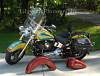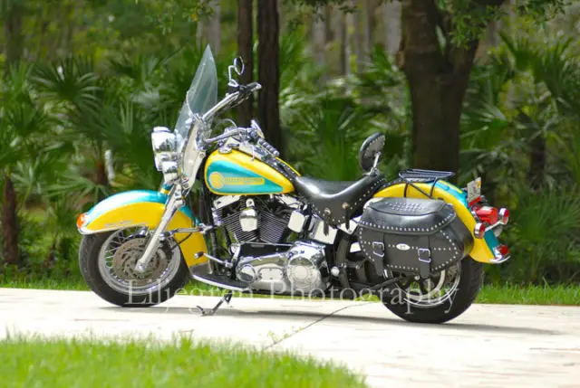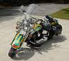 I am the original owner of this bike, nd had the custom paint workdone(Dave "Hotbrush" Hendrickson/SouthernFX, nglewood, L) approximately 4 years after purchase. The front and rear fenders and tank were purchased new from H-D, n primer. Approximately 3 months were spent in developing the color(s) and design elements. All graphics were designed and hand executed by Dave "Hotbrush" Hendrickson. I get manyfavorable comments on the bike's appearance, nd when women frequently compliment the colors, always reply, Thanks! My wife picked them out", hereby staying out of trouble.