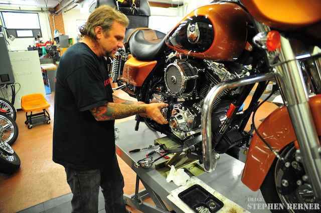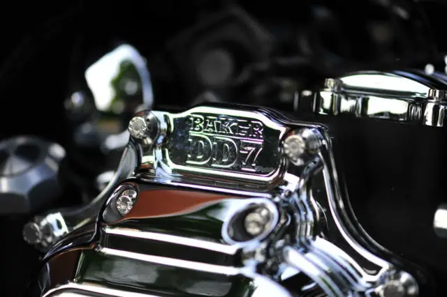 The engine is a beast, otally tractable (110HP, 26ft/lbs torque!) - is mechanically quiet and pulls pulls pulls. The entire, igh quality package works together flawlessly. The BAKER DD7 (yeah, hat's a picture of Bert himself installing this transmission @ Rosa's Cycles) is simply amazing, well done piece of machinery that allows the bike to travel down the road at high rates of speed, hile NEVER running out of steam. The engine/drivetrain/AIM lock-up clutch combo is exciting, bit like alchemy - the benefit is greater than the sum of the parts, he machine really is transformed into a sporty, ot rod tourer, he RaceTech custom shocks out back certainly help. Well, t least as sporty as a pig like the FLHX can be!