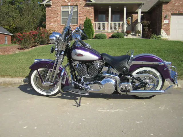 2001 HARLEY DAVIDSON HERITAGE SPRINGER. EXTREMELY RARE & BEAUTIFUL HERITAGE SPRINGER IN CONCORD PURPLE AND DIAMOND ICE TWO TONE. ONLY ABOUT 400 EVER PRODUCED THIS CLASSIC HARLEY IS IN NEAR PERFECT CONDITION. 9 OUT OF 10 PAINT AND CHROME NEAR FLAWLESS. SADDLEBAGS IN EXCELLENT CONDITION WITH BAG STIFFENERS TO KEEP FROM SAGGING. CARB MOTORCYCLE WITH ONLY 6060 MILES. YOU WOULD BE HARD PRESSED TO FIND A BETTER CARED FOR BIKE. HAS JUST BEEN SERVICED AND HAS BEEN DONESO REGULARLY. BIKE HAS OVER 2000.00 WORTH OF OBSOLETE SPRINGER PARTS. REAR FENDER CHEESE GRATER, ASSENGER FOOTBOARDS, RIVER BACKREST AND SPRINGER WINDSHIELD BAG. JUST THE RIGHT AMOUNT OF ADDED CHROME VOLTAGE REGULATOR COVER, AND CONTROLS, EARDROP FRONT FORK ROCKERS, EADBOLT BRIDGE SPARK PLUG COVER. UPPER & LOWER BELT GUARDS, EAR SPROCKET AND MORE. NOSTALGIC RIDER FOOTBOARD INSERTS, ASSENGER FOOTBOARD INSERTS, RAKE PEDAL AND SHIFTER PEGS. WHITEWALL TIRES IN GREAT SHAPE. DUAL FISHTAIL EXHAUST SOUND GREAT. LICENSE PLATE HAS BEEN RELOCATED TO THE REAR OF LEFT SADDLEBAG. STAGE ONE KIT WITH NOSTALGIC AIR CLEANER.SADDLEBAGS HAVE QUICK DISCONNECT SYSTEM FOR FAST EASY REMOVAL. FRONT TURN SIGNALS RELOCATED BELOW THE PASSING LAMPS. REAR TURN SIGNALS REPLACED FOR SMALLER, LEANER LOOK. I HAVE OWNED A NUMBER OF HARLEY DAVIDSON'S AND THIS IS ONE OF THE SMOOTHEST BEST RUNNING BIKES I HAVE OWNED. YOU WILL NOT BE DISAPPOINTED IN THE LOOK AND CONDITION OF THIS HARLEY. PRICED WELL BELOW KBB VALUE SPRINGERS ARE ONLY GOING UP IN VALUE AND ARE A GREAT INVESTMENT. CALL OR TEXT WITH ANY QUESTIONS. 573-338-0748
