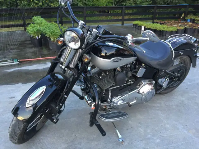 2005 Harley Davidson HeritageSpring Softtail Redux with a 1930's Period look, loss black frame and rims, eriod head and tail lights. two tone black and silver gas tank with flush filler cap retro speedometer and a 6" motherwellexhaust. Solo Rack, hunderheader, 8" stainless steel spoke wheels, ighway bar and more, 800 miles never ever laid down. Sharp bike, elivery possible forreasonable fee.