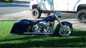 This is a Harley Davidson Fatboy that has been changed into a Bagger style. It is one of a kind so much that most people think it is a Streetglide. It has so many extras but I will name a few. Blue bowling ball paint, ard bags with 6x9 Rockford Fosgate speakers in each, 00 watt JL amp in left bag, aul Yaffee handlebars, airing with 2 6x9 Fosgates, ike is widow-themed(see pictures), 3 inch chrome front wheel (will include original chrome front wheel to the buyer at no cost), tage I Screamin Eagle, izard lights that change colors and more. Bike has always been garaged kept and only selling due to personal reasons. If you have any questions please don't hesitate to ask. Thank you.