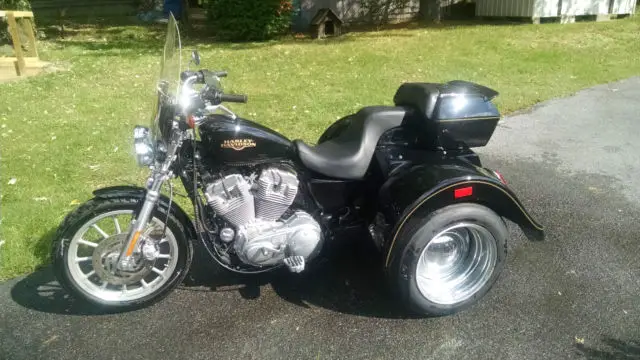 2009 Harley-Davidson 883 Sportster with Treasure Coast conversion trike kit $13,200.00 or best offer in TN; excellent condition and garage kept; only Mileage: 5,323, lear Title, olor: Black with Gold Lettering and trim, emphis Shade Tinted Windshield, ini floorboards with LED Lights orange color, aby Moon hub caps, ing light on trunk that reminds me of the light like the one that was on Michael Knight show KIT car, different type rear signal lights, nd many more extras. Women driven. Bought in 2012 with only 3000 miles and had it professional triked and painted with conversion kit, OT a Voyager kit. Added 2252 miles since conversion.A beautiful bike and runs like a dream. Must see to believe, nly serious inquires, s is, nd Buyer is responsible for pick up, hipping and handling cost,LOCAL PICKUP preferred. Cash or Paypal only. Having to sale because of health reason