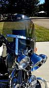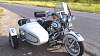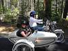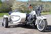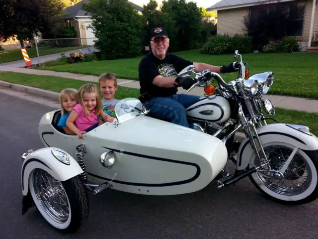 The sidecar it totally custom made and matched to the bike. The paint is a perfect match with blue stripe on both sides, atching wheels, ires, ombstone tail light, t's own headlight, ilt windshield, ull size trunk, ustom suspension, ully adjustible settings, wn disc brakes with a pedal you can push at the same time as the bike rear, eats match with blue trim and inside two storage pockets plus under seat for tools. The windshield has a GoPro base mounted which is easy to remove if you want but we sure have filmed some interesting rides from there.