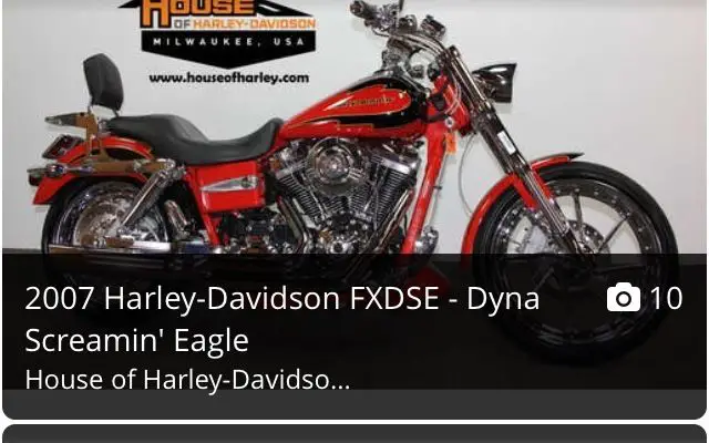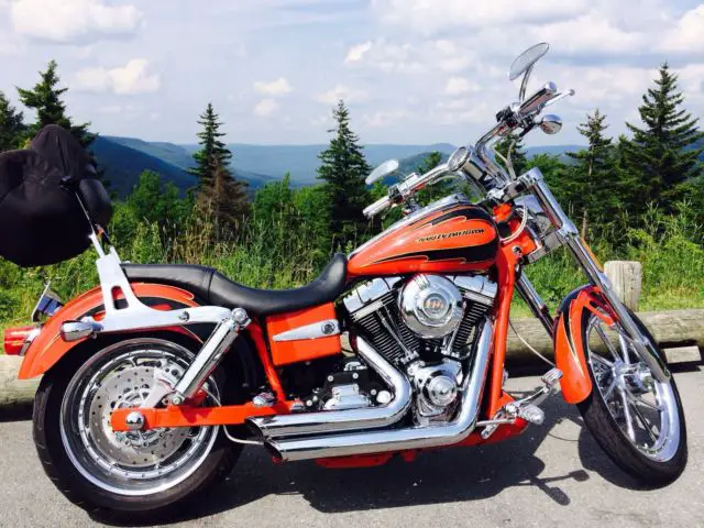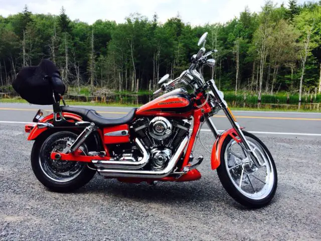 2007 Harley Davidson Screamin Eagle Dyna Super Glide CVO (FXDSE) under 6,000 inferno red/desert black/gold leaf. Custom exhaust, tage 3 programmer, etachable sissy bar 110 cubic engine (1800cc).