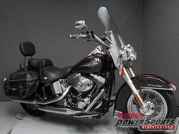 This Harley Davidson Heritage Softail Classic is a one owner bike, nd has been upgraded with aftermarket slip-on mufflers, n open air intake, nd aftermarket grips. a 1450CC v-twin engine with a 5-speed transmission, he Heritage puts out 75ft-lb. at 3500rpm. It has a seat height of 27.4", nd a dry weight of 696lbs.