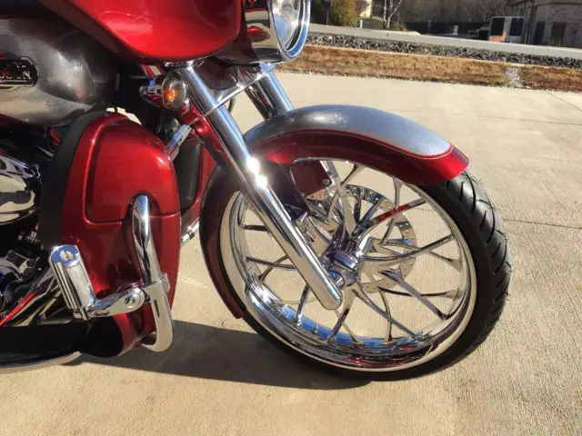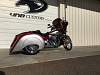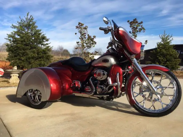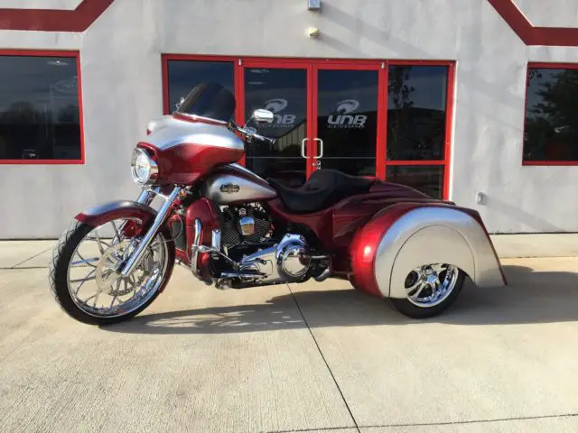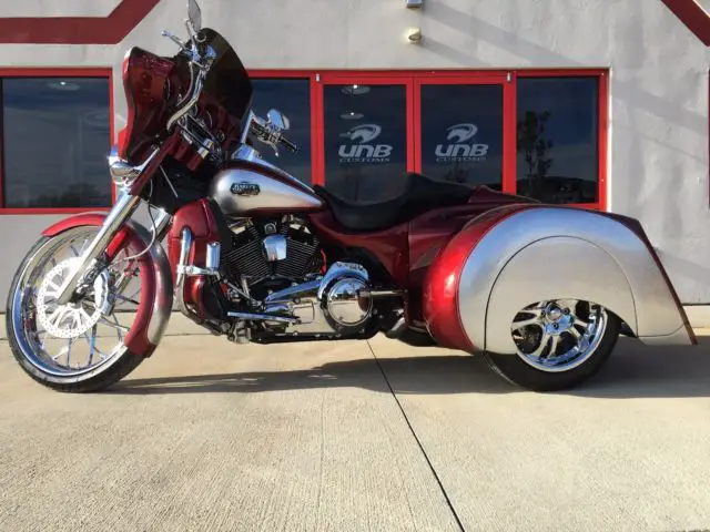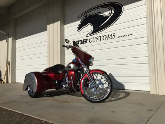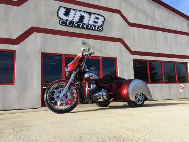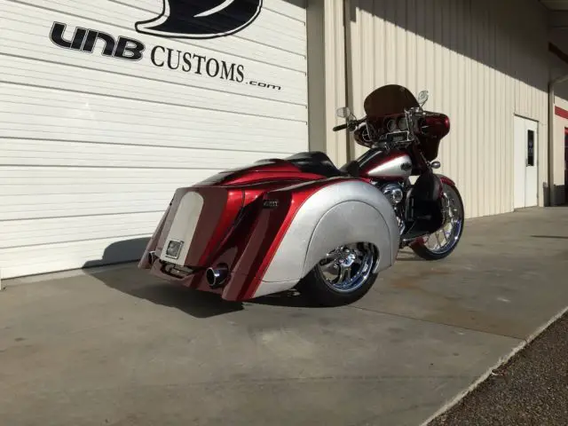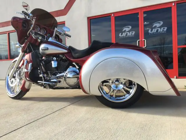 This 2009 Harley Davidson Ultra Classic Trike has just finished being completely customized with a 2016 Hannigan independent suspension trike kit with custom big flake silver and sunglo red paint.