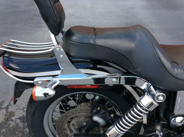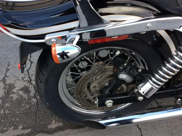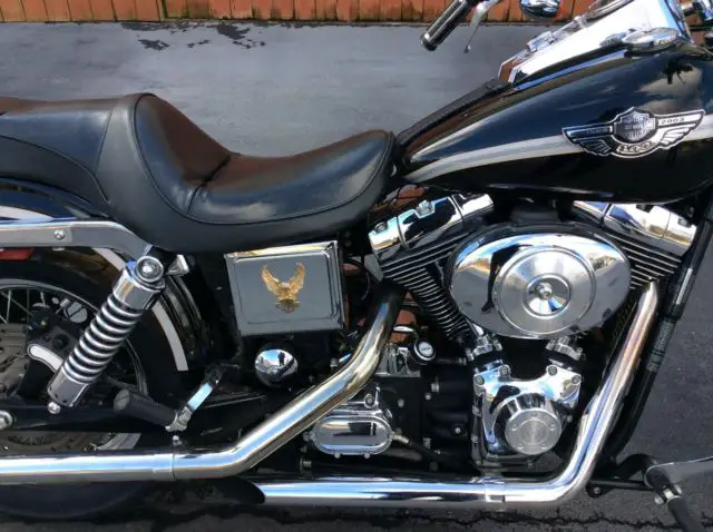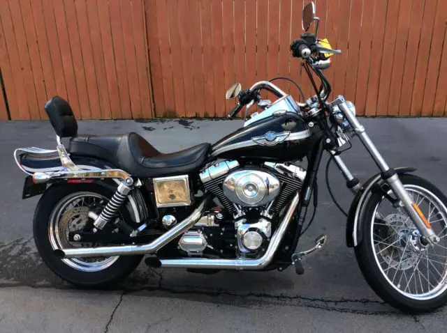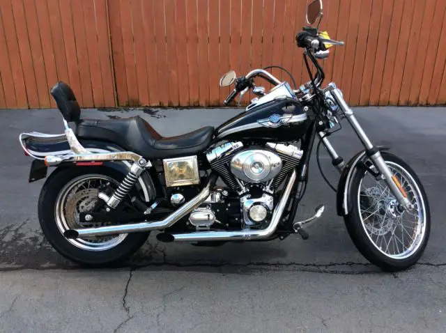 THIS IS A 2003 FXDWG VIVID BLACK ANNIVERSARY DYNA WIDE GUIDE. OUR DEALERSHIP TOOK THIS BIKE IN ON TRADE AND SOME SERVCE WORK WAS DONE. IT HAS A NEW FRONT AND REAR TIRE. NEW REAR BRAKE PADS. 20 K SERVICE. THE EXHAUST HAS BEEN CHANGED TO GIVE THAT GREAT HARLEY SOUND. THERE IS SOME RUST ON THE SIDE OF THE BATTERY COVER. IT HAS A SISSY BAR AND A LUGGAGE RACK FOR YOU TO BE ABLE TO CARRY EXTRA THINGS. THIS BIKE LOOKS GOOD AND RUNS GREAT. OUR PICTURES TRY TO SHOW ALL THE BIKE HOWEVER SOMETIMES THINGS ARE MISSED. IF YOU NEED MORE PICTURES OR HAVE QUESTIONS PLEASE CALL 678-228-8213 OR E-MAIL.