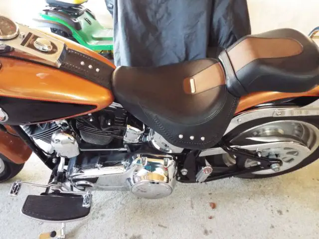 2008 Harley Davidson. copper and black numbered bike.