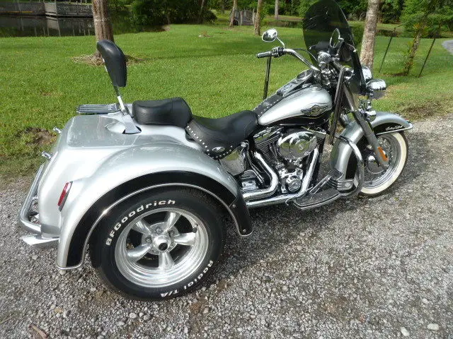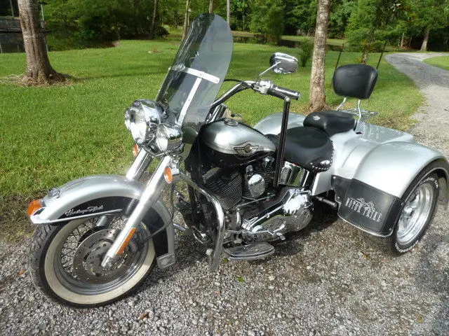 2003, 00th Anniversary Harley Davidson Heritage Softail Classic Trike, LSTC, otor Trike conversion, ilver/Black, ir ride suspension, degree rake for easy steering, nly 18,260 miles, uns like new, arbureted, lutchWiz, ots of chrome, instriping, ew rear tires, ew Odyssey battery, ew LRS re-curve tinted windshield, resh oil change (Amsoil), eady to ride, nspected 1/16, lean title in my name.