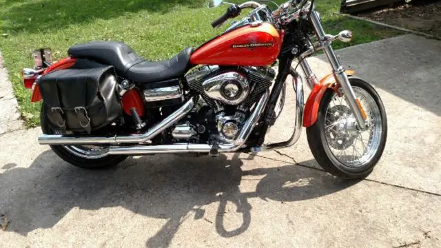 This is a 2012 Harley Dyna Super Glide. It has 5300 miles on it and hasn't even had it first oil change. I have 4 qts. of Amsoil for it's change when it gets to 6,ooo mi. I put a new set of Vance and Hines pipes on it last summer, t also has the live to ride covers on both sides plus the tag bracket. The bike has a factory limited paint called Tequila Sunrise. I have an older set of Willie and Max saddle bags. My friend said he thinks they are out of the 60's, ven if they are old they still are in good condition. I have a cover that goes with it plus a full face helmet that is new and an older one that is in good condition. I also have a quick release windshield and a sissy bar. There are no issues with the bike, t's that I have a medical condition that makes me taking a big chance riding. I also have a Dodge diesel truck and trailer and I will bring the bike to you if you'll help with the fuel bill. Any questions please ask. I also have the stock pipes and a few parts that goes with it.