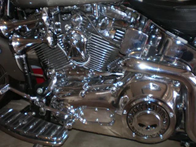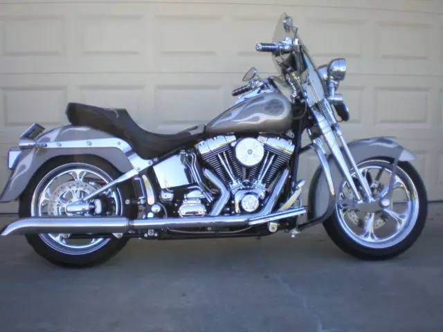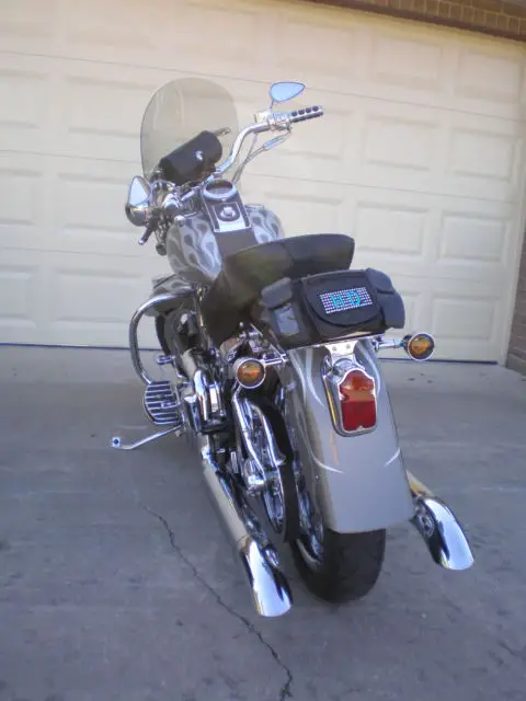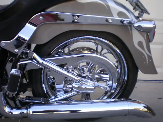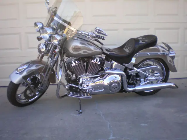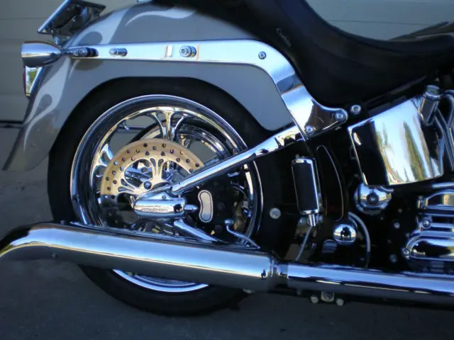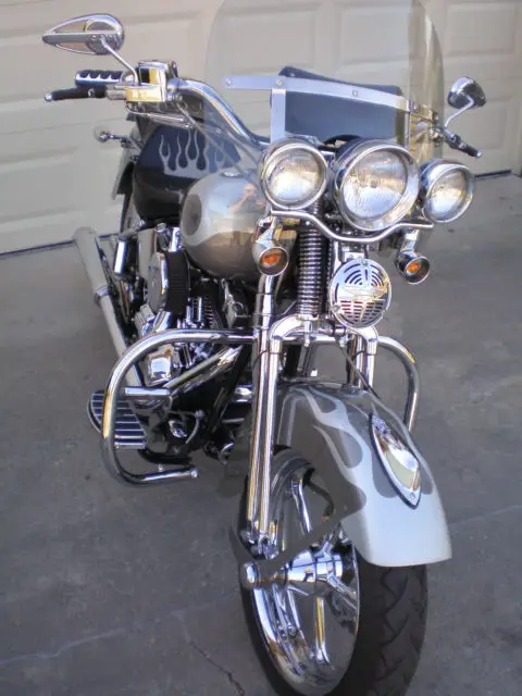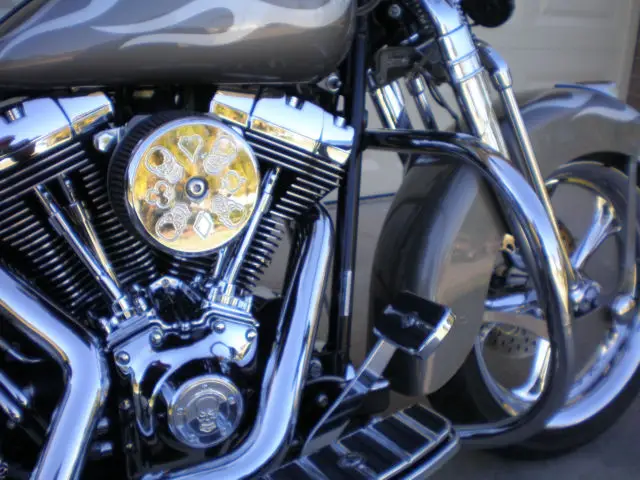 Chrome, hrome and more Chrome! Custom 2002 Springer, uel-injected 1350 cc with beautiful custom paint with flames and scull theme throughout this gorgeous motorcycle. Did I mention it is completely chromed out? Includes custom low profile Michelin tires (brand new rear tire) and custom designed wheels with matching brake rotors and drive belt pulley, ulti-function LED Lights, indshield with HD bag, uick release backrest with luggage rack, atching Ostrich Corbin seat, ouble air horns for extra safety, ighway pegs, ecurity system and a Stage 1 kit. This bike is not only stunning, ut fast and has power to spare. All maintenance records kept while with this owner. Adult Lady owned, idden and pampered. Did I mention all the chrome? You will love how it looks and handles. You must like attention, ecause it draws attention wherever it goes. You will not be disappointed riding this art in motion. Bring your sunglasses. This bike needs nothing but a rider who likes attention. And “Extended Warranty” that is fully transferable to new owner. Yes that’s correct!!! A gorgeous Springer, hromed out, ll the extras you would spend huge money on, ustom paint, ims, strich seat, tc, eeding nothing but a rider, nd YES a WARRENTEE!!! WOW!!!! Clear Florida title, ill of sale and always garaged in Florida. I do not offer shipping but can coordinate with your shipper or you could ride this home. This Bike is offered for sale locally. Winning bidder will send non refundable Deposit $500 dollars US via PayPal within 24hrs and balance in cash at pickup before bike moves unless other arrangements are made prior to end of auction. Do not bid unless you have the money. This is the bike you dreamed of owning.