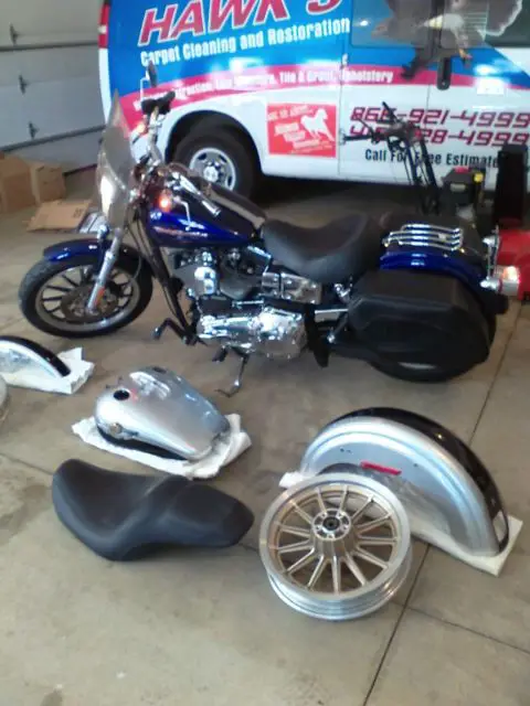 This Low Rider is a great motorcycle, ven for the newest Rider. It's 2003, 00 year anniversary, ith indigo blue pearl paint set, urrently on the bike, lso come with the original anniversary black and silver paint set. You also get the black rims that are on the motorcycle, long with the anniversary gold rims. The motorcycle has stage 1 kit with Screaming Eagle slip ons. There are 13,799 miles on it, as been well stored in garage for 8 years. It has not been serviced but it does start and run. This great bike needs a good new home and comes with lots of extras.