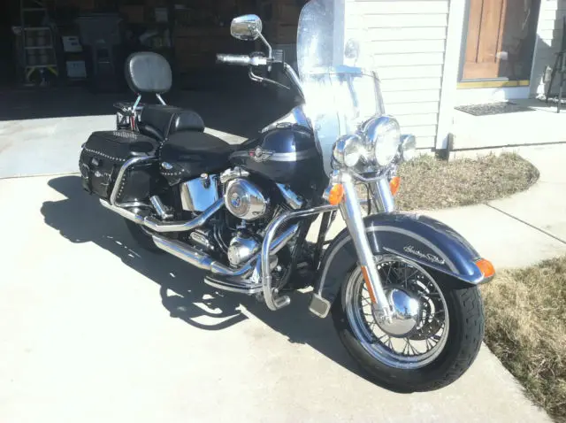 2003 Harley Davidson Softail Heritage Classic, un metal pearl blue 100th anniversary paint job. Boss bag saddle bags with stiffener upgrade. Stage 1 upgrade with electronic chip and screaming eagle pipes. Meticulously serviced, ept cleaned, nd maintained. Serviced on 3/15/16, ew tires, ew brakes. Everything looked at and in excellent condition.I originally bought it with 4,850 miles, urrently at44,532 miles.Nice looking bike!