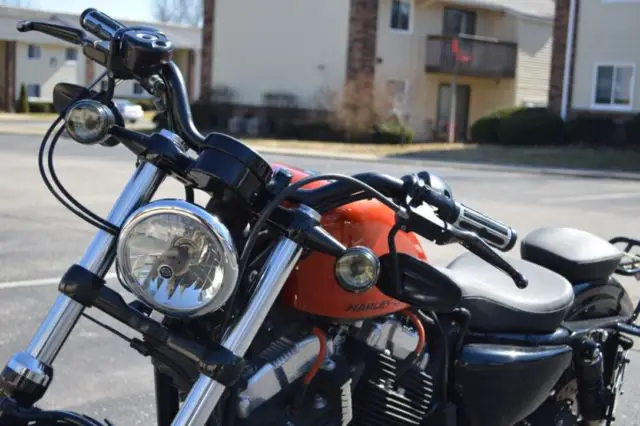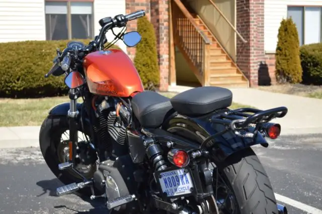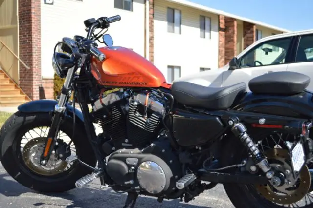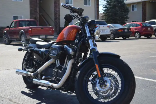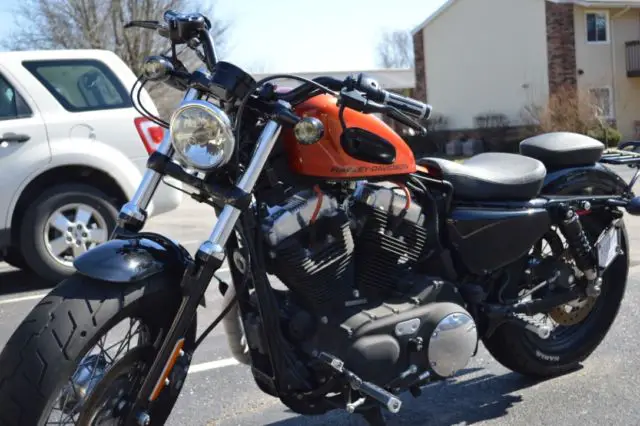 Beautiful, anly, arley Forty Eight (XL1200X) has 86XX miles for sale. It's in excellent condition with normal wear and tear. Burnt Orange color, cream eagle 1200cc engine (air cooled). It has blacked out engine, ilver exhausts with heat wrap around them, ngine temperature display on the side and a custom gas tank cap. You also get a pre-installed luggage carrier, detachable passenger support and 2 helmets. It looks super cool, e ready to be waived by and getting complements from lots of people.