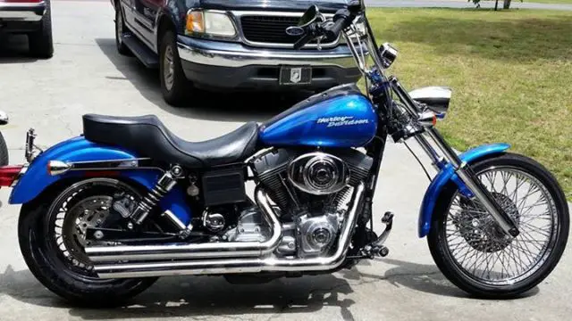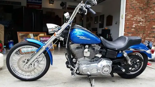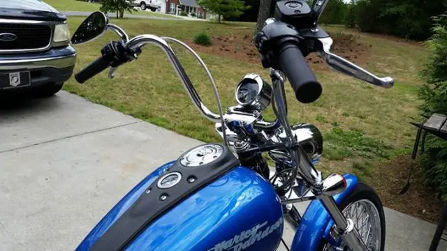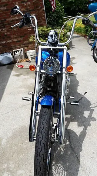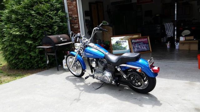 This is a beautiful Blue Harley Custom, 004 Superglide with ape hangers, creaming eagle pipes, aked front end, orward controls, xtra chrome, poke wheels, ickstand extender etc...... New tires, ew battery.... All up grades done by Harley Davidson! Clear Title, arrage kept, ick Up only.....located in Calhoun Ga.