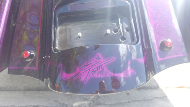 No expense was spared on this road king which was completed for Sturgis in 2015 and was built as a showpiece to bring to different bikeweeks and motorcycle shows across the country. This bike started life as a new 2013 FLHP police roadking. The bike was stripped down to the frame and the work began. The major metal work and fabrication were as follows; frame was cut and raked in the neck, urved down tubes installed, he seat pocket was cut and dropped, aking this a drop seat, nd the factory Harley tank and rear fender were stretched (so this is a Harley tank, tretched, ll steel.) This bike recieved all of the awesome American steel machined and american chromed Thunder Cycle Parts including the following; axel caps, ork bells, anhead rocker boxes, he entire "Diamond series" (floorboards, rips, eservoir caps, erby cover, iming cover, ramsmission cover, tarter cover, nd turn signal minimizers, into 1 Thunder thumper exhaust, hifter, reak pedals, hunder Cycle mini apes (all internally wired and internally cabled) and more. The Bones paintjob matched up with the anodized rims isPM wheels is neck breaking. This paint job is amazing and Bones, s usual, ailed the artwork and graphics which also include the hand laid and airbushed silver leaf!. The entire bike including the frame, andlebars, nd more have been custom painted. The PM wheel, he curved down tubes, he amazing paint, he hand stretched gas tank and rear fender, nd the diamond cut motor are just some of the things that make this bike pop. This bad boy also has got the treatment of the diamond cut motor along with Sachs racing polished heads, ith cams this bad boy is making over 110hp!! If they don't see you coming...they'll here you coming!! This bike has a banging system with a large touch screen. The amp, ires, nd speakers were installed extramely neatly and the bags still have plenty of storage.