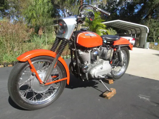 I AM SELLING MY 1968 HARLEY DAVIDSON XLH BECAUSE I AM ALMOST 73 YEARS OLD AND REDUCING MY COLLECTION. I AM THE THIRD OWNER OF THIS MOTORCYCLE. THIS MOTORCYCLE WAS RESTORED FROM THE ORIGINAL BIKE USING ORIGINAL FRAME, HEET METAL, HEELS, NGINE COMPONENTS WITH THE EXCEPTION OF PISTONS, ALVES ETC.USING ALL QUALITY PARTS AVAILABLE. THERE IS APPROXIMATELY 1,200 MILES ON THE REBUILD. THERE IS NO POWDER COATING ON THIS MOTORCYCLE. THE SHEET METAL HAS BEEN PROFESSIONALLY PAINTED IN COLOR MAPPED DUPONT CHROMA 1 JETFIRE ORANGE WITH PROPERLY APPLIED CRINKLE BLACK CENTER STRIPE AND TAPED WITH WHITE ACCENT SIDE STRIPES AS ORIGINALLY APPLIED BY THE FACTORY. ORIGINAL HEADLAMP, ACELLE, AILLAMP ETC FROM THE ORIGINAL BIKE WERE MAINTAINED. ENGINE BELLY NUMBERS MATCH AS DOES THE FRAME DATE CODE AS THESE ARE THE ORIGINAL PARTS TO THIS MOTORCYCLE. LIGHTS, AUGES, ONTROLS ALL WORK PROPERLY. THE ONLY UPGRADE OTHER THAN A NEW BATTERY IS A BENDIX ZENITH CARBURETOR. IF YOU ARE FAMILIAR WITH THESE BIKES AND THE ORIGINAL TILLOTSON CARBURETOR YOU UNDERSTAND WHY. FOR THOSE OF US THAT WERE AROUND IN THE 60'S AND KNEW SPORTSTERS, HE ELECTRIC STARTER (WHICH WORKS PROPERLY) WAS FIRST INTRODUCED TO SPORTSTER IN 1967 IS A WELCOME ADDITION AND AT OUR AGE, AYBE EVEN A LIFESAVER. :)THERE ARE VERY FEW 1968'S AROUND IN THIS CONDITION EITHER IN ORIGINALITY OR QUALITY. AS YOU CAN SEE THE BIKE COMES WITH QUITE A FEW OPTIONS. BECAUSE OF THE AGE THE MOTORCYCLE IT IS BEING SOLD AS IS WITH NO WARRANTIES, HECK MY FEEDBACK AND BID WITH CONFIDENCE. IF YOU NEED HELP WITHSHIPPING I CAN RECOMMEND A FEW EXCELLENT ECONOMICAL TRANSPORTERS WITH 100% FEEDBACK. THANKS FOR LOOKING AT MY AD AND HOPEFULLY THE NEXT OWNER OF THIS BIKE WILL ENJOY IT AS MUCH AS I HAVE. ANY QUESTIONS PLEASE EMAIL OR CALL. IF YOU LIVE LOCALLY AND WOULD LIKE TO SEE THE BIKE CALL BRIAN AT 386-738-5113.