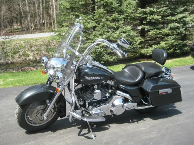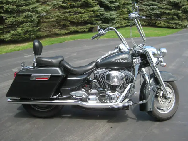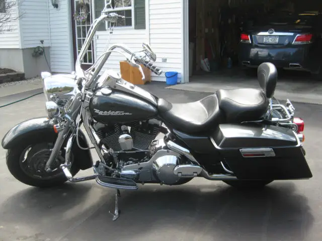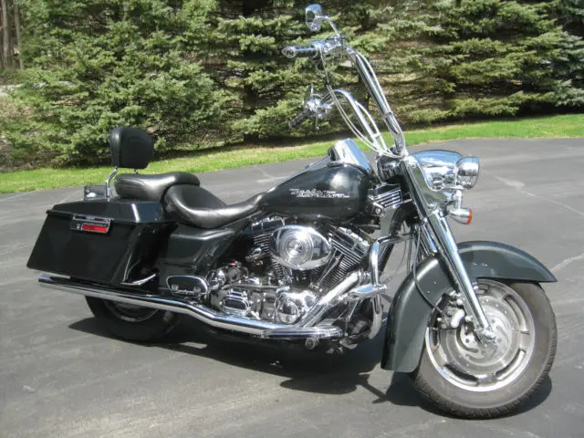 Hi for auction is my 1997 Harley Davidson EVO 1340 Road King in mystique greenand black. I am the second owner of this motorcycle . Its bean kept in the garage all its live and never seen any rain during my or the previous owner ownership . The mileage is 14450 genuine mails . Its been really well looked after and fully loaded with extras . Previous owner ordered this motorcycle with all the Harley Davidson bling and I upgraded the engine and suspension spending a little fortune. List of extras :-detachable screen-detachable sissy bar-crash bars-pannier trim-pannier inner bags-vintage look hand grips-rear indicator bar with integrated LED stop light-brake disc caliper and lover fork covers with light-various other chrome covers-Michelin CommanderII tyres (90% tred fitted earlier this year)            -Odyssey battery (this thing will never fail you 12yers expected live)    -Mikunni HSR42 total carburetor kit(intake manifold. carb . irbox KN air    filter . halk cable dialed in at Mats Machine Shop-Crane HI4N ignition kit (the newest improved model of the best ignition systems for those motorcycles . itted witch Crane coil and Crane HT leads-Pingel Hi flo fuel tap-Andrews EV27 cam fitted at Mats Machine Shop-Screaming Eagle clutch spring -Vance Hines truth dual exhaust headers-Vance Hines Monster Ovals exhaust-Progressive Suspension 940 Ultra Touring shocks (the highest and most expensive modelthat gives you slight lowering )-Progressive Suspension Monotube Fork Cartridge Kit-Progressive Suspension TOURING LINK Chassis StabilizerBed point is a small dent on the front fender that i couldn't capture in the photos . I am not by any means desperate to sell this motorcycle so please no sylly offers. You are more then welcome to come and viev/inspect the bike before you bid but no testpilots . Cash on collection only . Wining beder have to make contact within 24h of the auction end to arrange the collection .