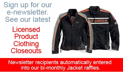 Be sure and visit our Harley-Davidson Licensed Product Clothing Closeout eBay store. nbsp;click here to visit. We keep several hundred of these special purchase items on eBay at any one time. They are pulled from our main web site which contains over 26. 00 listings. Our Licensed Product closeout items sell for 40% to 70% off regular prices and we have over 73. 00 positive feedbacks. We also have a Used and Aftermarket Parts Closeout store. click here to visit. We have 14 containers of used parts at Barnett Harley-Davidson along with clearance items we pick up from aftermarket manufacturers. This store will save you a lot of money.
