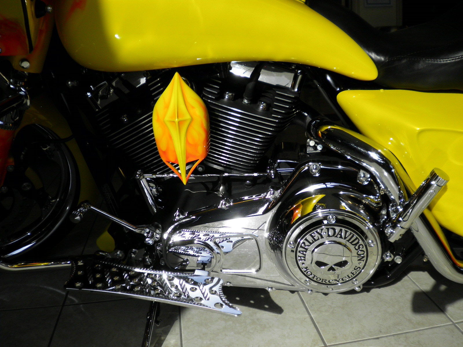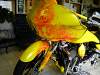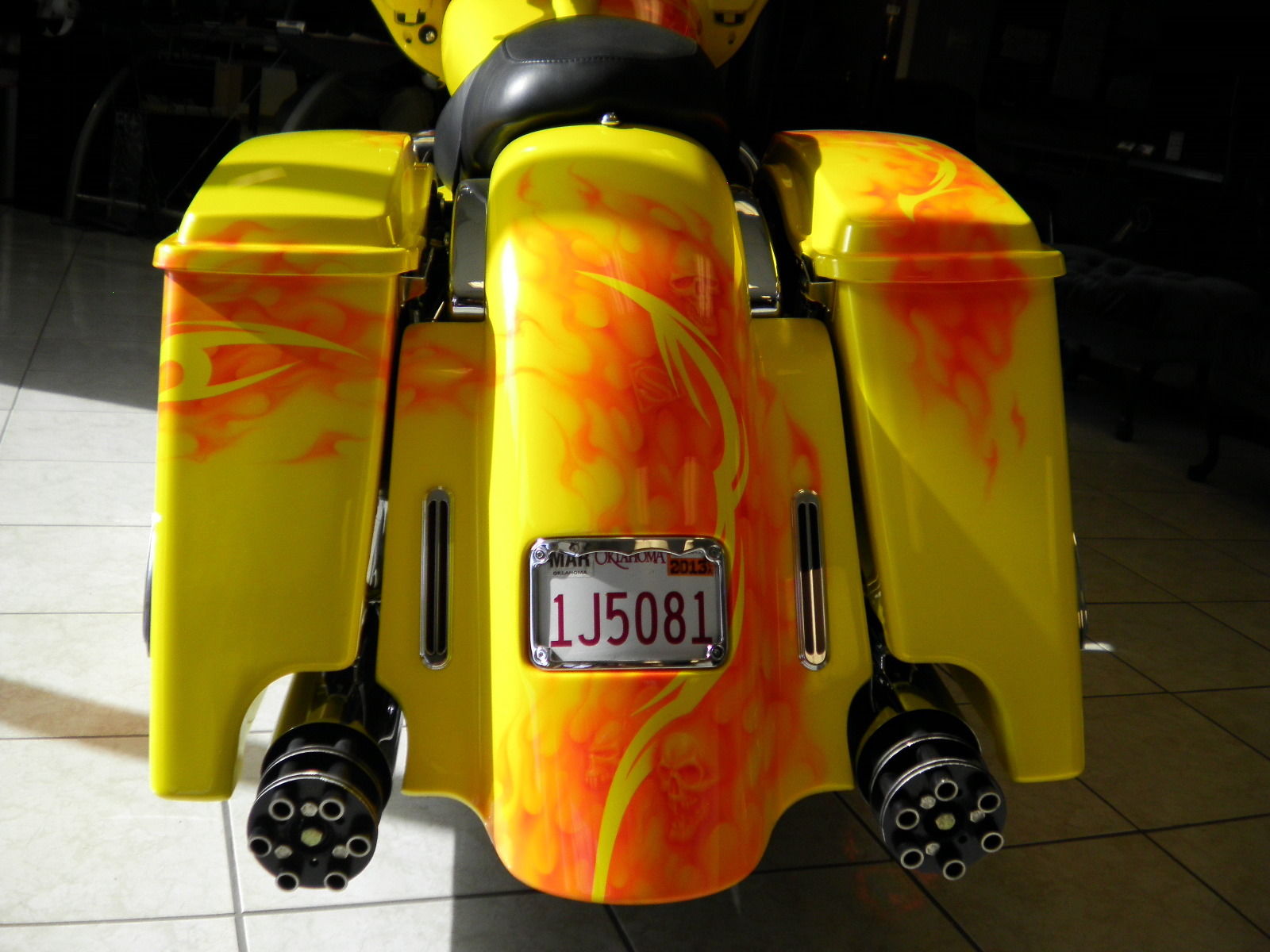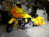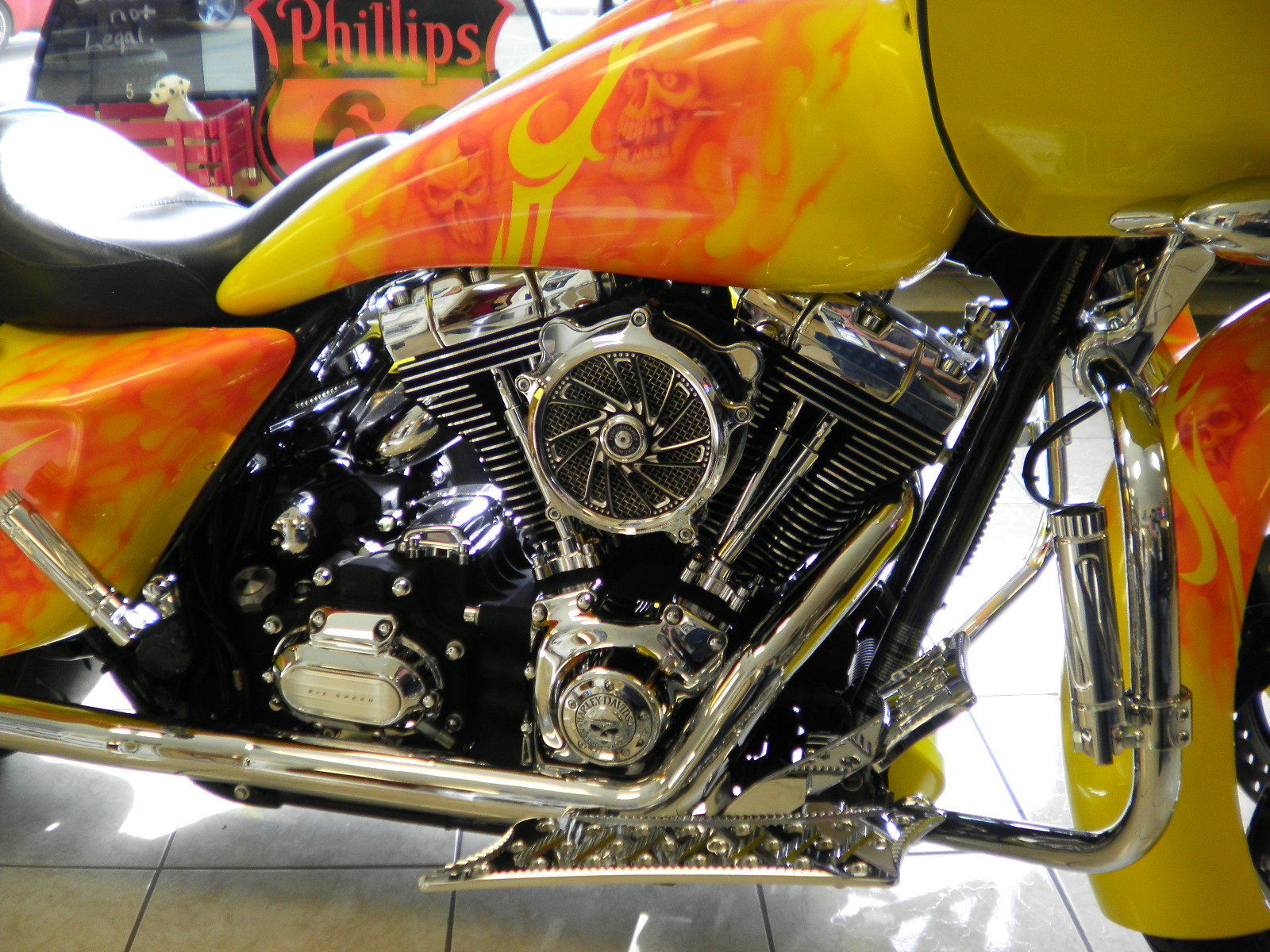 2011 harley road glide custom house of Kolor candy yellow paint custom house of kolor candy orange graphics Sinister Industries Hot Rod Bars Sinister Industries stretched PPO bags Sinister Industries billet bag accents Sinister Industries Gnarly bag latches Sinister custom dash kit Sinister Gauge pod Sinister "Pissed Off" headlight bezel H. I. D. headlights Sinister horn cover custom painted Sinister smooth rear fender Klock Works hugger front fender Sinister stretched tank seat fitted to tank Sinister "wicked" windshield molded to fairing Sinister billet pegs and floor boards sinister billet cans smoother and painted fork legs sinister billet brake pedal Arlen Ness billet mirrors saddle bags leather lined skull derby cover skulltiming cover chrome upper and lower mast cylinder covers J&M 7. 25 upgraded speakers and hidden antenna kit performance machine air cleaner front wheel is 21x3. 5 Zeinth rear wheel is 16x5. 5 Zeinith front tire is Avon venom 90/90/H21 rear tire is Avon Venom 180/60R/16 matching hubs and front rotors factory ABS brakes front lowered 2" progressive suspension rear is lowered 2" adjustable from 1-3" exhaust is true dual from Tailgunner slip ons are Gunships from Tailgunners LED chrome Liscense plate frame Jaded Oval Chrome taillights Chrome engine dress up kit have 20. 00. 00 in reciepts plus the bike.