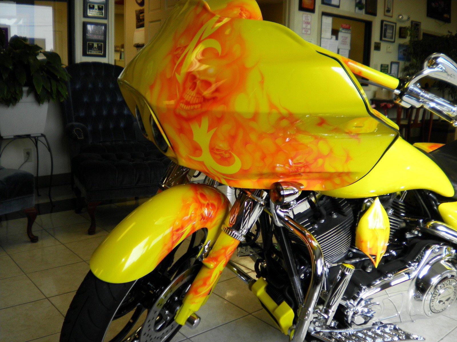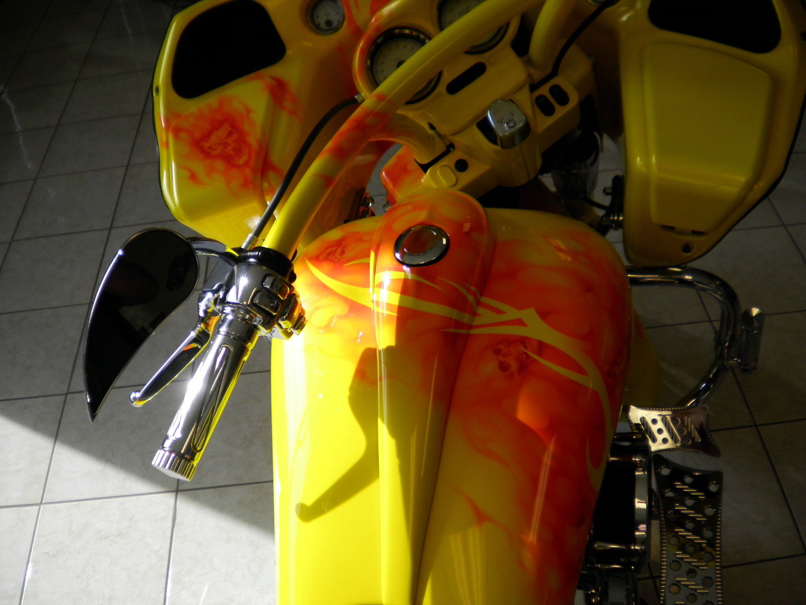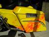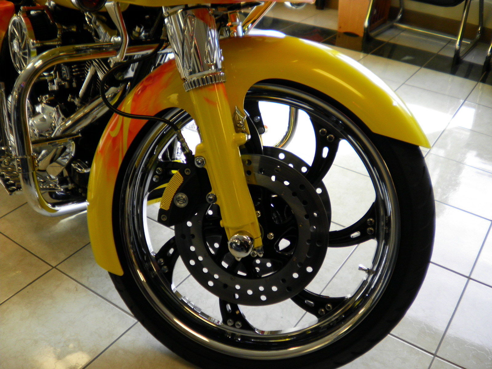 2011 harley road glide custom house of Kolor candy yellow paint custom house of kolor candy orange graphics Sinister Industries Hot Rod Bars Sinister Industries stretched PPO bags Sinister Industries billet bag accents Sinister Industries Gnarly bag latches Sinister custom dash kit Sinister Gauge pod Sinister "Pissed Off" headlight bezel H. I. D. headlights Sinister horn cover custom painted Sinister smooth rear fender Klock Works hugger front fender Sinister stretched tank seat fitted to tank Sinister "wicked" windshield molded to fairing Sinister billet pegs and floor boards sinister billet cans smoother and painted fork legs sinister billet brake pedal Arlen Ness billet mirrors saddle bags leather lined skull derby cover skulltiming cover chrome upper and lower mast cylinder covers J&M 7. 25 upgraded speakers and hidden antenna kit performance machine air cleaner front wheel is 21x3. 5 Zeinth rear wheel is 16x5. 5 Zeinith front tire is Avon venom 90/90/H21 rear tire is Avon Venom 180/60R/16 matching hubs and front rotors factory ABS brakes front lowered 2" progressive suspension rear is lowered 2" adjustable from 1-3" exhaust is true dual from Tailgunner slip ons are Gunships from Tailgunners LED chrome Liscense plate frame Jaded Oval Chrome taillights Chrome engine dress up kit have 20. 00. 00 in reciepts plus the bike.