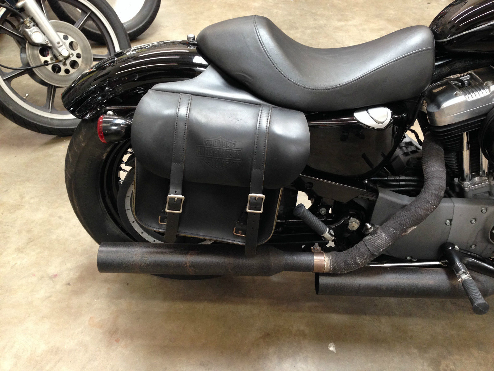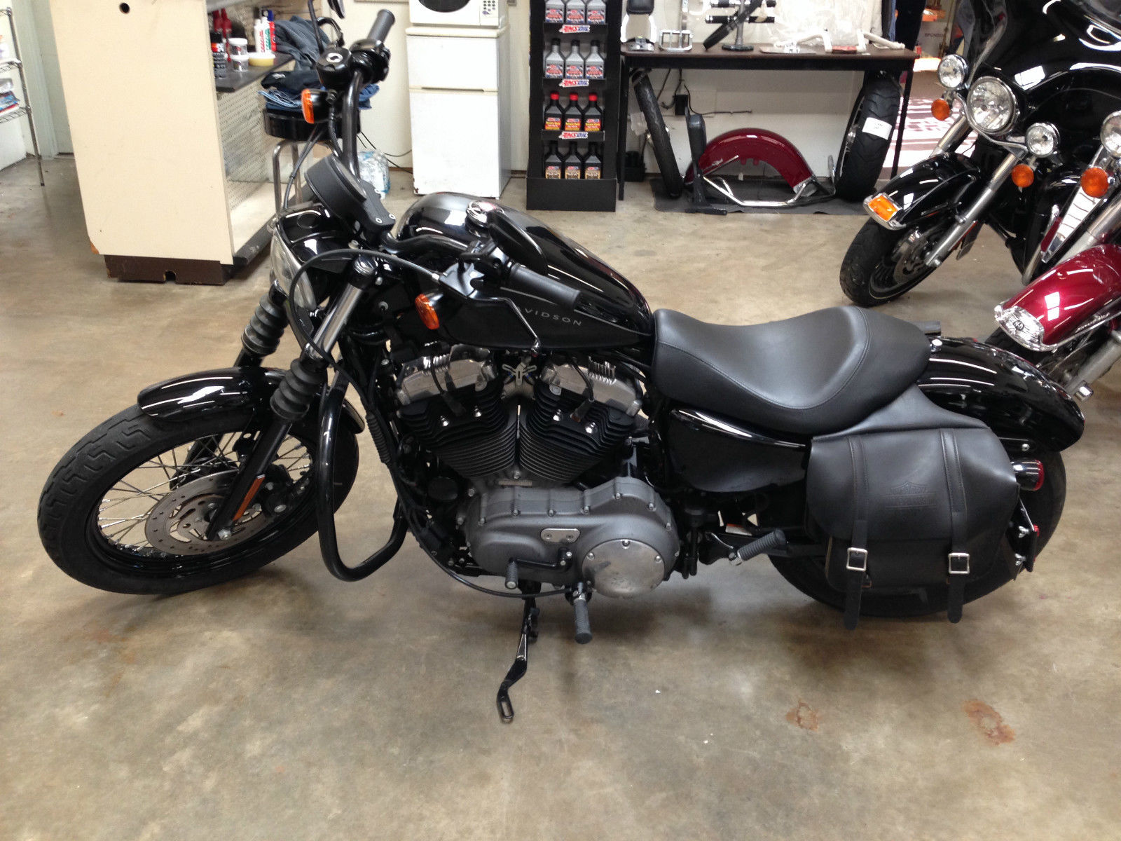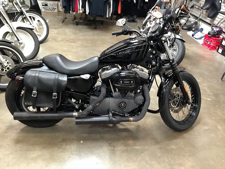 For sale is one 2009 Harley Davidson XL1200N Nightster Motorcycle with 7825 miles in excellent garage kept original owner condition. This black motorcycle is outfitted to suggest a more vintage look in fact I have often been asked how old the machine is and greeted with a look of surprise to hear that it is a 2009 model. Additions include wide handle bars. black straight cut exhaust with grey fiberglass wrapped pipes. black engine guards. ultra bright headlight lamp. glossy black air filter cover. vintage style enamel badged gas cap. This sportster has customized Harley Leather throwover bags that will let you pack some gear and a change of clothes for a trip. They have been customized to hug the frame with a fitted liner that surrounds the shocks allowing them to fit closely to the cycle with the shocks concealed within. This adds to the more vintage look of the bike. Bike has a new HD Battery and comes with the like new original chrome mufflers and an HD passenger seat that can be fitted and attached to the single passenger seat if desired. Tires are good but I recommend a new rear tire in the near future. This ais a great looking bike with spirited handling and performance for a Harley.