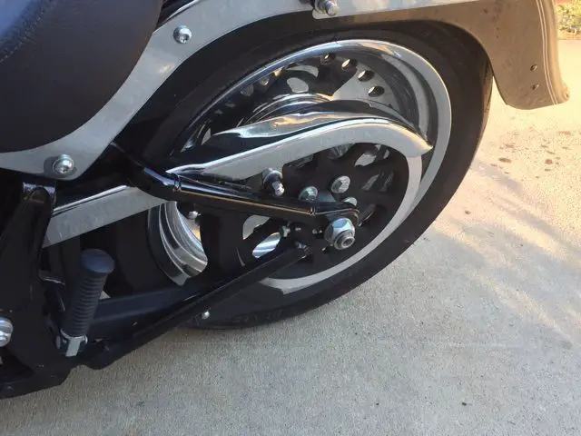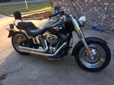 2013 Harley Fat Boy Vivid Black Chrome Wheels Stage One All services done by local Harley Shop. Detachable Harley Davidson Saddle Bags. aftermarket seat and short sissy bar Aftermarket Vance and Hines exhaust. tires in real good shape runs extremely well. Six speed transmission. This bike gets over 40 MPG. Front tire width 140 Rear tire 200 MM.  Included but not mounted a HD Chrome front caliper. Has the 1690 CC 103 CI engine. Bike has been lowered 1/2 inch.