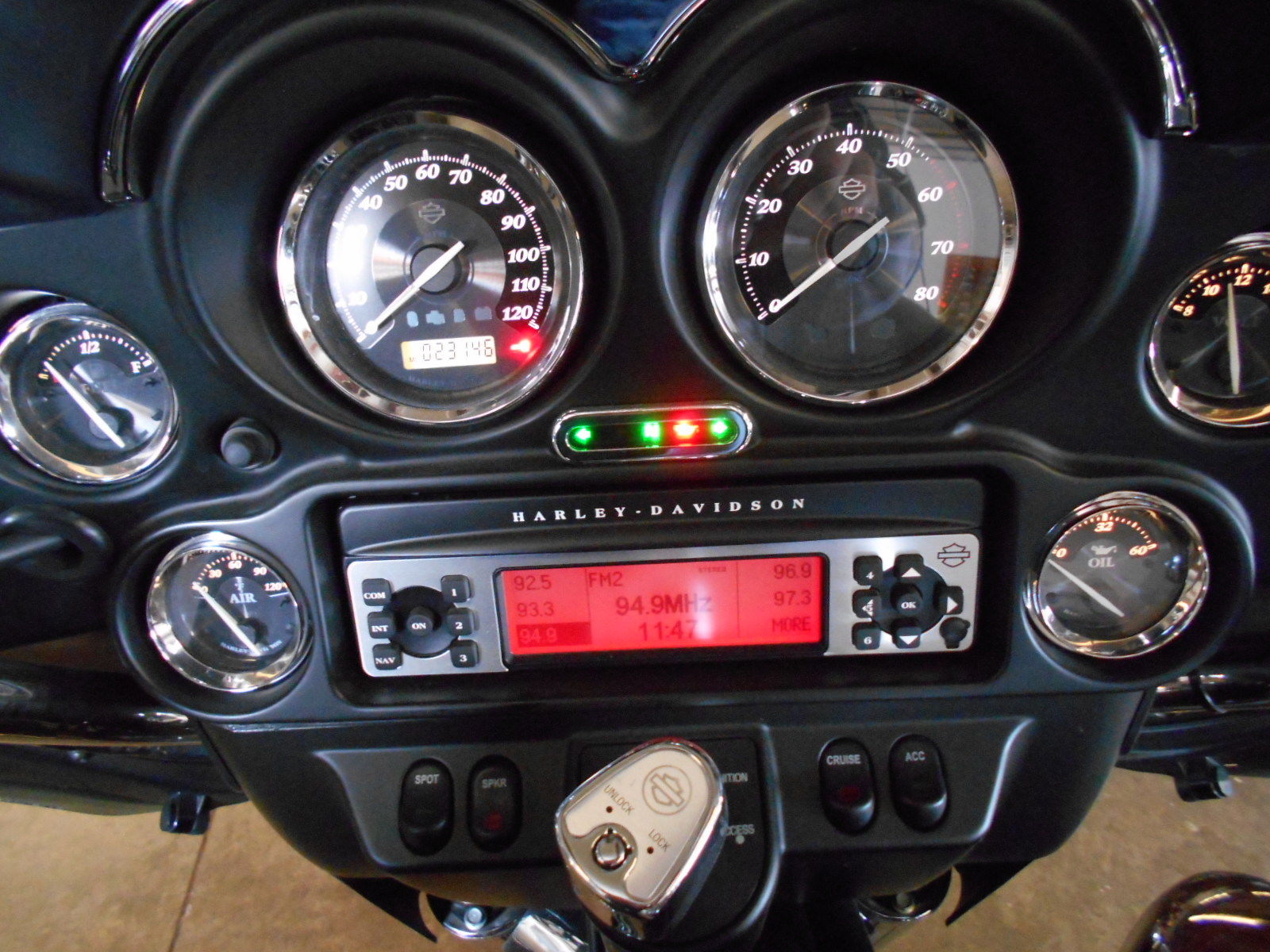 Instruments: Fairing-mounted electronic speedometer with odometer; time-of-day clock on CD player/stereo; dual trip meter; low fuel indicator light and mileage countdown feature; low oil pressure indicator light; engine diagnostics readout; LED indicator lights; 6-speed indicator light; cruise control indicator light; tachometer with fuel. voltage. oil pressure and ambient air temperature gauges