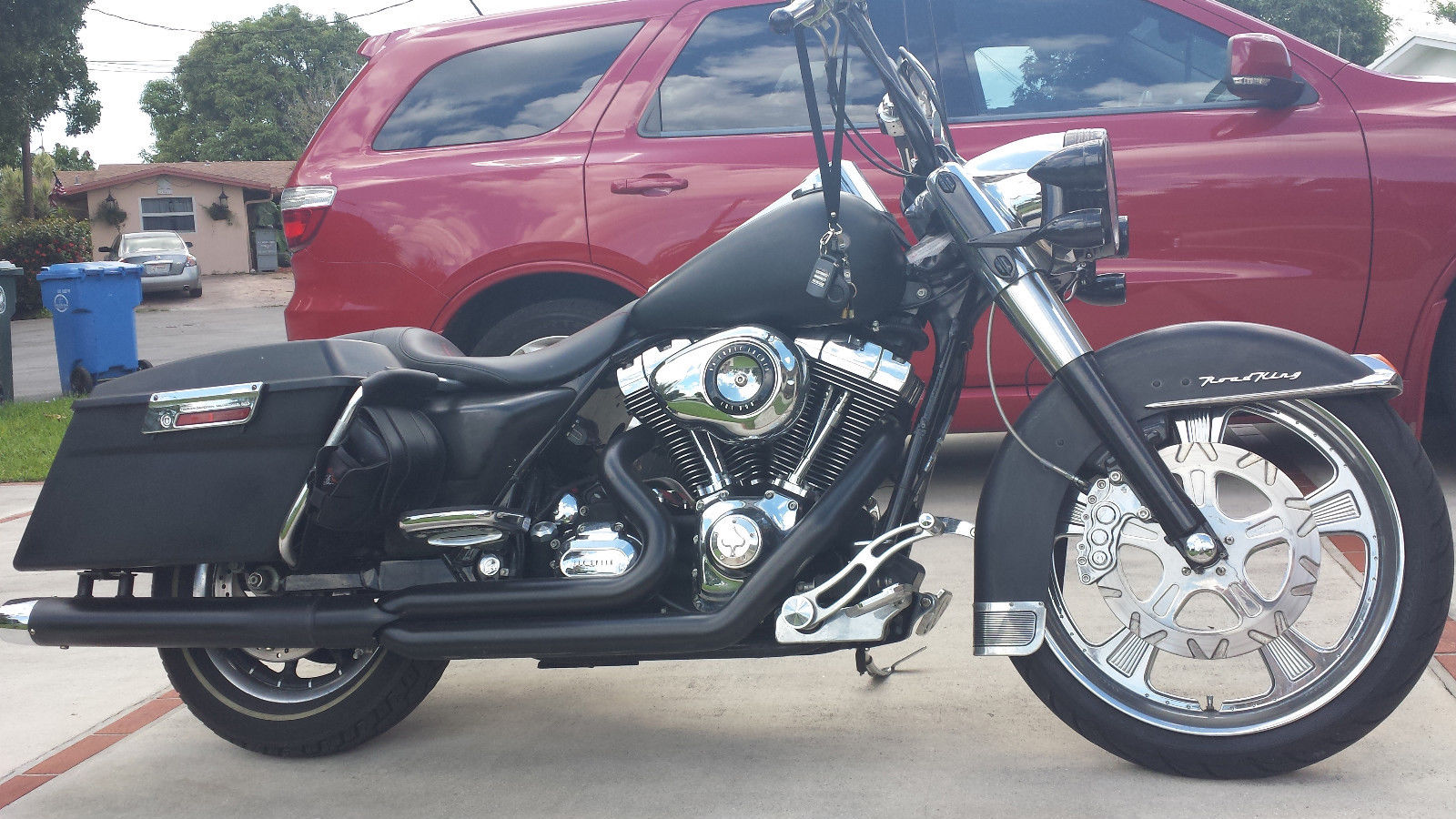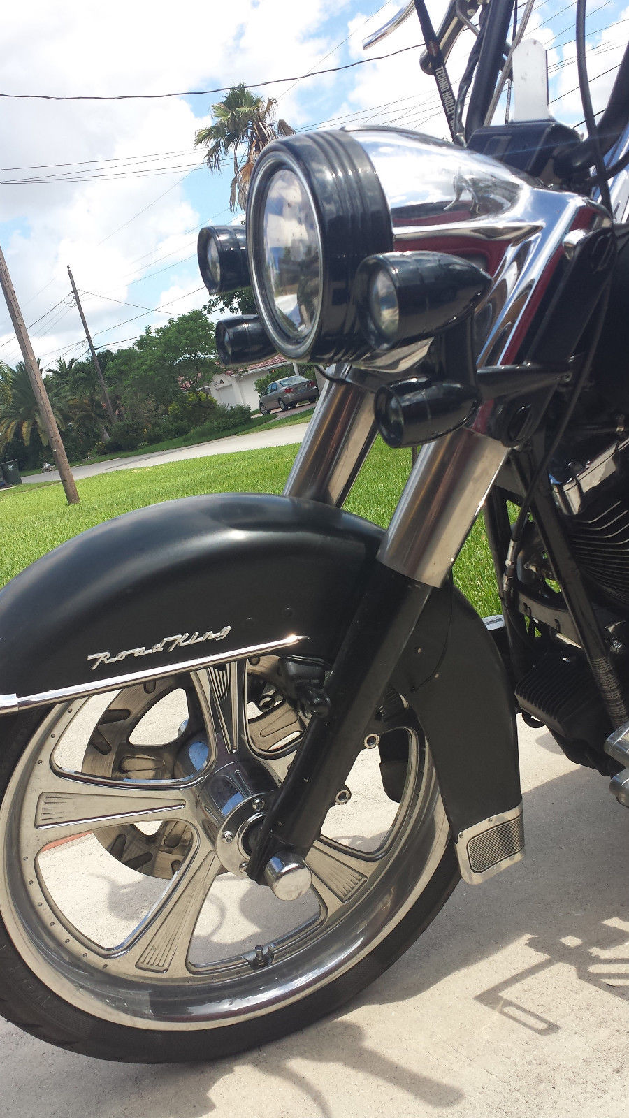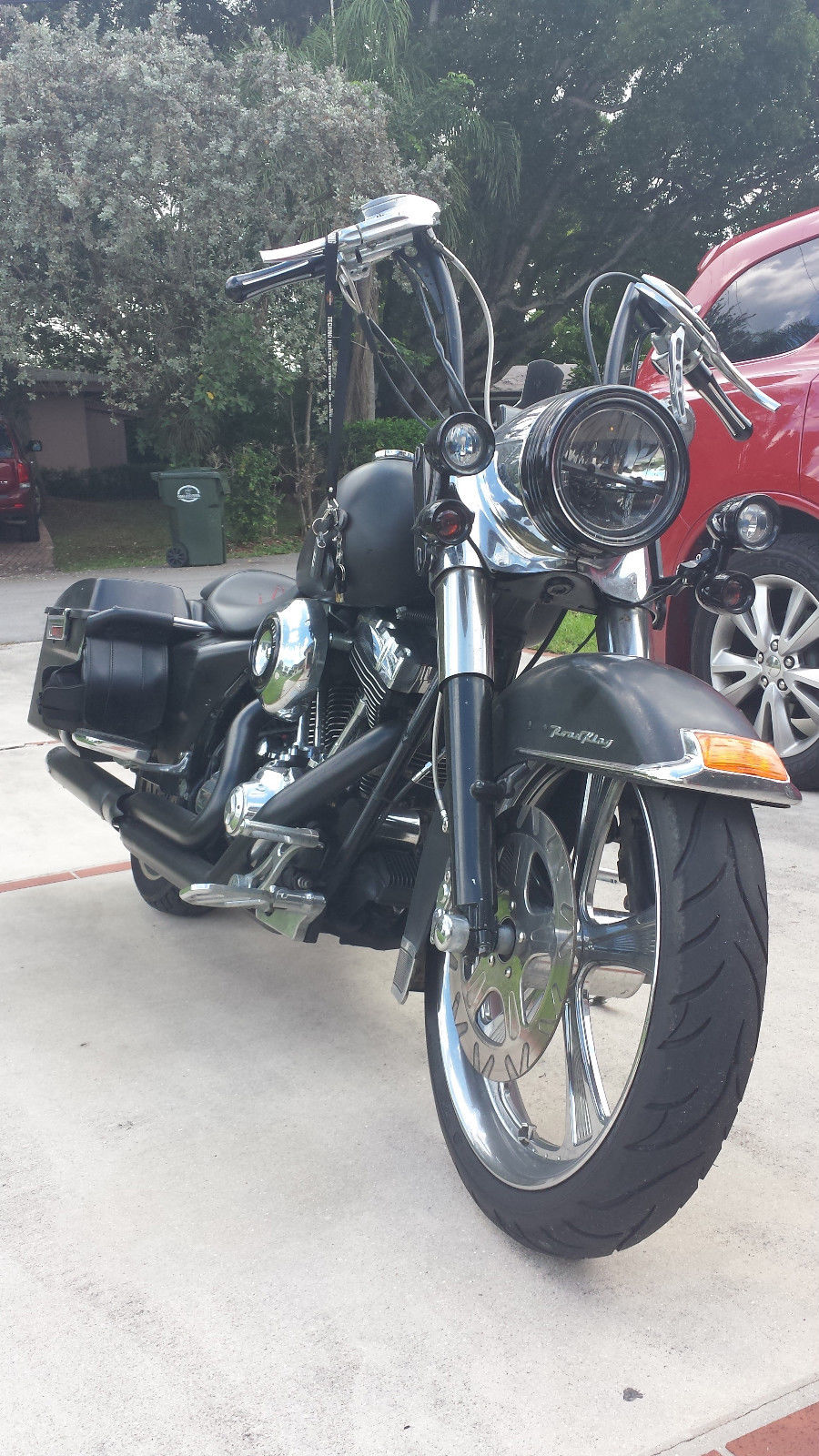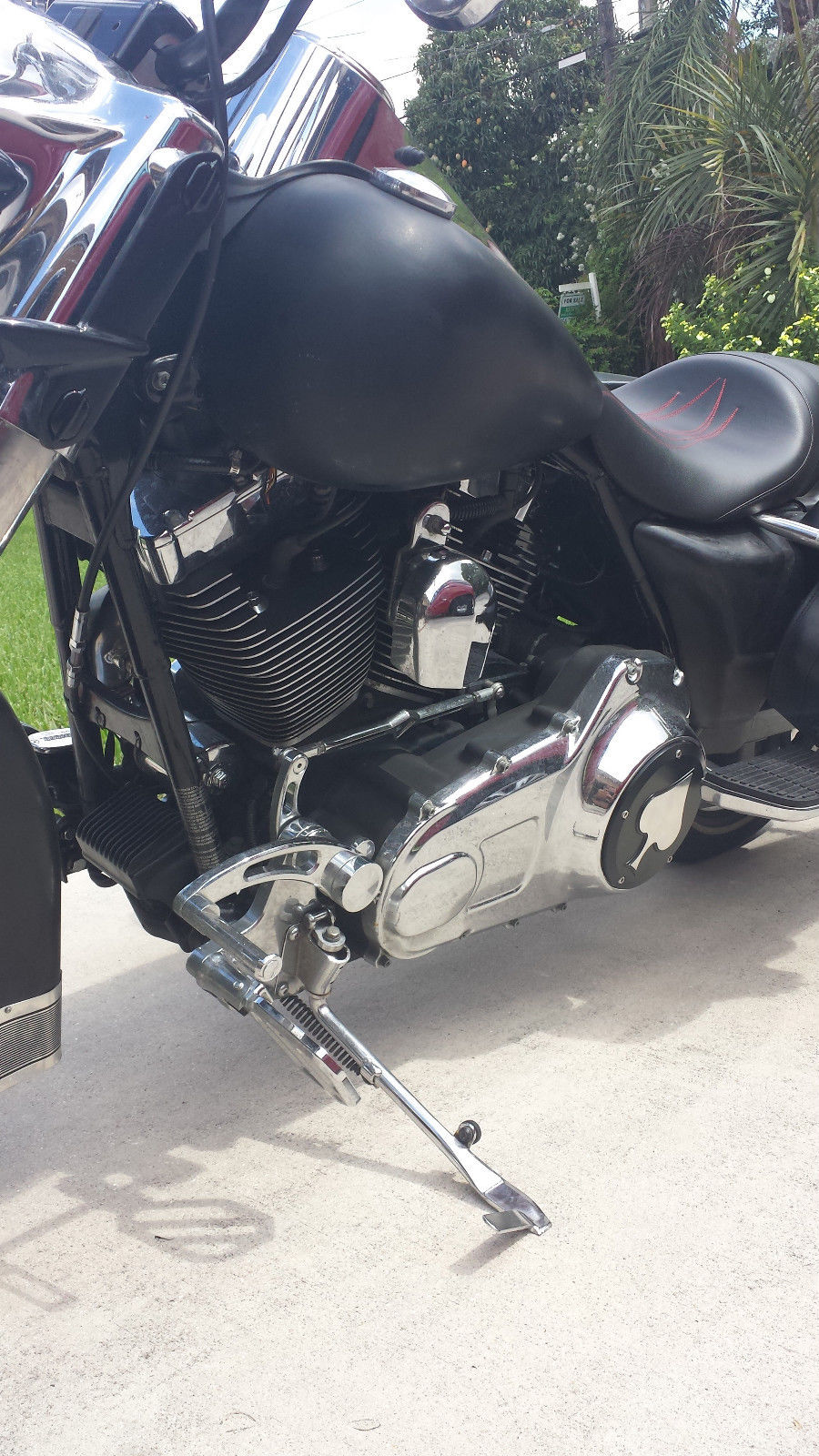 I'm selling my 2007 Road King because I have too many bikes. 31K miles. 103 engine. 6-speed tranny. I've done the following modifications for the bike:- 21 x 3. " RC Comp billet chrome wheel / 120/70-21 tire- 13" matching RC Comp brake disc- Jay Brake 6-piston Ultra chromed billet brake caliper- Russel steel braided brake line- Arlen Ness Rad hand controls and switch housings (9/16 brake master for single front brake)- Thunder Cycle billet grips- Bonanza 13" bars- LA Choppers billet handlebar risers- Kuryakyn Phase 7 LED headlight- Kuryakyn Halo LED headlight trim- Kuryakyn Hi-output spotlights and turn signals- Accutronix billet chrome forward controls- RUSH 2 into 1 exhaust system- Arlen Ness Big Sucker air cleaner- Low profile custom seat- Billet Boys license plate holder with LED lights- Billet Boys rear turn signals- Lay down clear LED tail light- H-D Tach / Speedo Combo- Detachable sissybar / luggage rack with quick release docking kit- Detachable tourpack docking kit Bike needs a new paint job unless you like the satin / flat black look. I was going to do extended bags and fenders etc. so the paint job wasn't on the list until after the new tins. Clean & Clear Florida title in hand. Will assist with shipping at buyers expense! I also have good contacts for overseas shipping to Europe