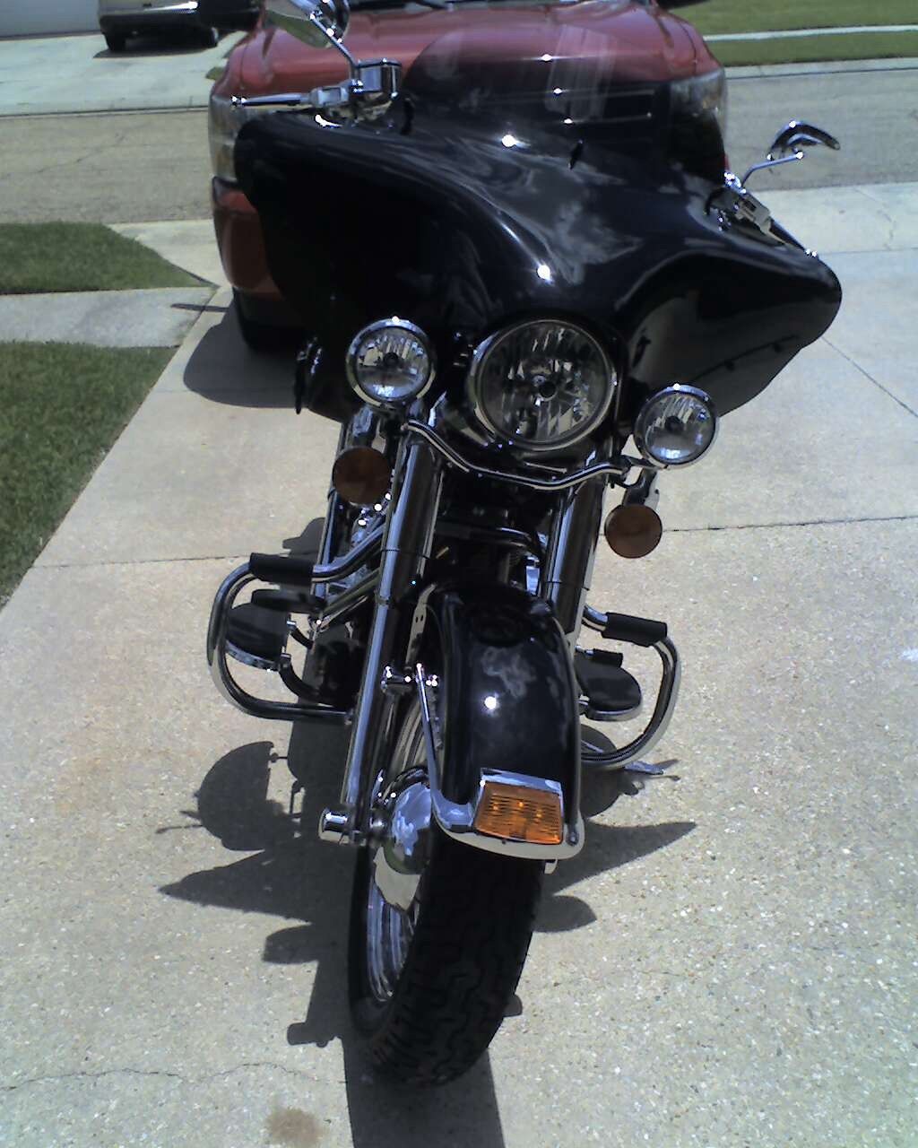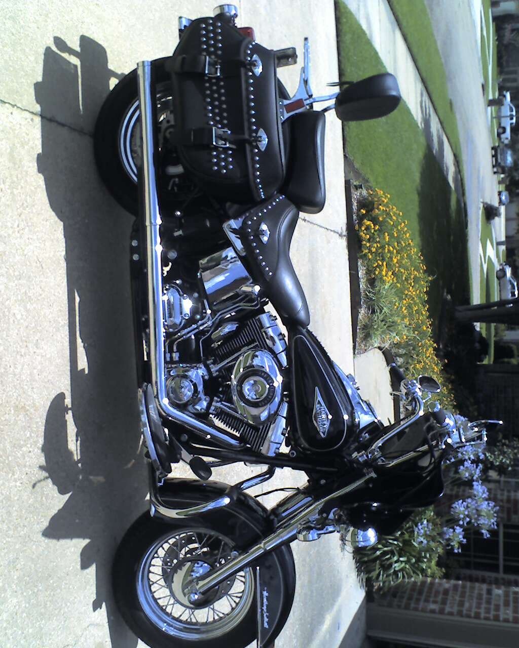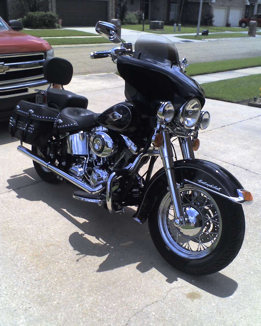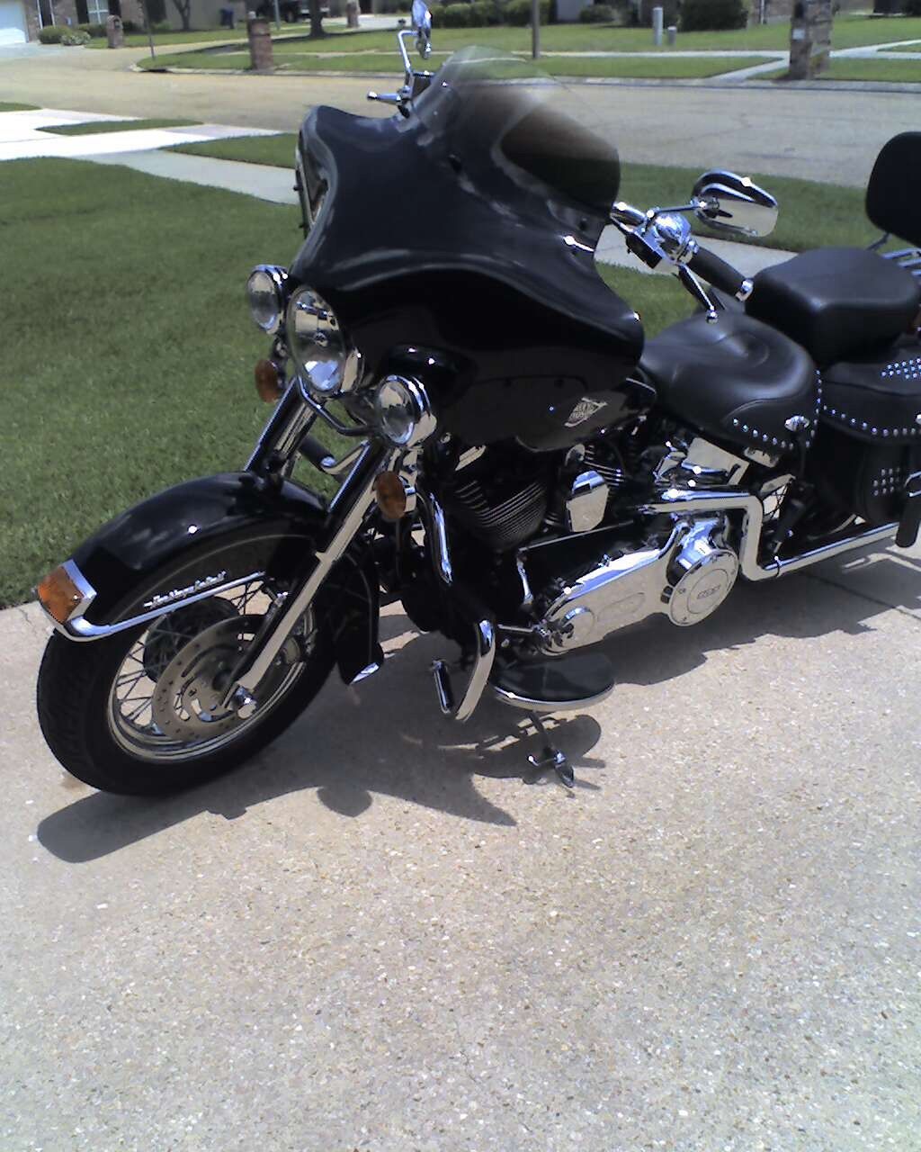 this heritage looks like a street glide after I installed the memphis shades batwing fairing. Works great and looks much better than a windshield. Bike has many upgrades. Everything on the handlebars is chrome. lowers are chrome. has engine guard. vance & Hines true dual exhaust. power commander for great performance and the engine runs cooler. Saddlebags have the kit so they will hold their shape. This bike has never been in the rain. It sleeps in my climate controlled garage. I'm 72 years old and nervous on this big bike. I bought this bike new in December 2012 after the 13;s were out. I have the 9" windshield on the fairing now but I also have a 7" if you're shorter. the 9" works better for me. The bike also has the thing installed that makes the rear turn signals work as tail lights. I've installed ISO grips also. Most of the bolts and screws are covered with chrome toppers. This is a beautiful bike that gets lots of attention wherever I go. You won't be disappointed!