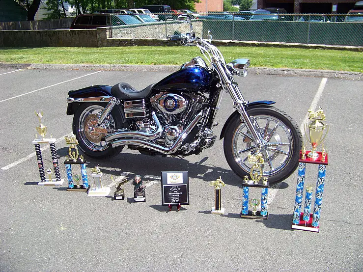 The wheels have great tread and have less that 1000 miles on them. I have all service records and you can talk to my mechanic Pete at Novello's if you want the history from him.  The title is clean and clear. The used condition lists a scratch on the top of the tank which is super fine and can be buffed out. scrape on bottom of chrome engine cover left side no larger that a pinky print and not visible. and normal paint wear under the two up seat that can be buffed out. The scuffs to the pipes and peg were a result of me leaning the bike once. I was at a stand still and with the bars turned wrong and I leaned it down. The paint job on this is amazing by the way.  It is a custom design by myself and is on Cutting Edge Illusions website under the name Blue Bayou. Is has 8 layers I think and has great depth. At bike shows people would touch the tank like their finger would go into the paint. Funny! It is basically a blue/purple/green color shifting base with metallic silver textures like flames or smoke with a blue candy clear coat and multiple layers of clear coat. I have always gotten looks. compliments. one guy told me it was the best bike out of ten plus at my job. I have 17 trophies which includes multiple Best In Show and Best In Class. nbsp; My notable wins include Best In Class at the famous Orange County Choppers and my triple at Hot Rods and Harleys in Rawwah. NJ when I won Best In Show. Best Chrome. Best In Class over 100+ other motorcycles. I really hit the shows between 2009-2011 but have since got tired of doing them. I also have the stock headers and the Screaming Eagle Slip on for the buyer if they chose to revert back to something less load. This bike is very clean and looks amazing for it's aged considering all the chrome.  Please note that I have not found any pitting on any of the chrome and the only spot I an not satisfied with is the front sliders which are HD genuine chrome parts and have a tiny flake near the mount screw. Too thin for my liking and I was going to dip them but they look good still. Â