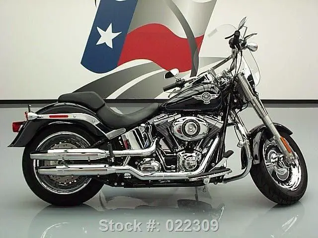 2013 Harley-Davidson FLSTF Softail Fat Boy Cruiser Motorcycle (1690cc 2cyl 6M) with Black Paint and Black Saddle.   Loaded with Rigid-Mounted Counter-Balanced Twin Cam 103B V-Twin Engine. Electronic Sequential Port Fuel Injection (ESPFI). Black Powder-Coated Powertrain with Chrome Covers. 6-Speed Cruise Drive Manual Transmission. Chrome Over/Under Shotgun Exhaust. Low Profile 1. 25 Inch Internally-Wired Handlebar. Bare Knuckle Risers. Odometer Trip Switch. Single Button Hazzard Warning. Large Odo. Readout with Gear and RPM Display. Chrome Front Fork Nacelle. Chrome Nostalgic 7-Inch Ball Headlamp. 5-Gallon Fuel Tank. Chrome Horseshoe Oil Tank. Chrome Tank Console with Electronic Speedometer. Full-Size Rider Footboards. Two-Piece Two-Up Softail Seat. Custom Trimmed Front Fender. Silver 200 mm Rear Tire. Bullet Hole Disc Wheels and more. At Texas Direct. you save all you can save. We cut out the bull. and work hard to deliver a great product at rock bottom prices. Ready to save today? Give me a call and well talk about how to get a deal going. Yes. It's True!!General informationModel:Harley-Davidson Softail Fat BoyYear:2013Category:Custom / cruiserEngine and transmissionDisplacement:1687. 97 ccm (103. 00 cubic inches)Engine type:V2. four-strokeEngine details:Air-cooled. Twin Cam 103B™Torque:133. 84 Nm (13. 6 kgf-m or 98. 7 ft. lbs) @ 3000 RPMCompression:9. 6:1Bore x stroke:98. 4 x 111. 3 mm (3. 9 x 4. 4 inches)Fuel system:Injection. Electronic Sequential Port Fuel Injection (ESPFI)Cooling system:AirGearbox:6-speedTransmission type. inal drive:BeltClutch:Multi-plate with diaphragm spring in oil bathDriveline:Primary chain. 34/46 ratioFuel consumption:5. 60 litres/100 km (17. 9 km/l or 42. 00 mpg)Greenhouse gases:129. 9 CO2 g/km. (CO2 - Carbon dioxide emission)Exhaust system:Chrome. over/under shotgun exhaust with dual mufflersChassis. suspension. brakes and wheelsRake (fork angle):31. 0°Trail:147 mm (5. 8 inches)Front tyre dimensions:140/75-R17Rear tyre dimensions:200/55-R17Front brakes:Double disc. 4-pistonRear brakes:Single disc. 2-pistonWheels:Silver. Bullet Hole Disc Cast AluminumVIN 1HD1BXV14DB022309 / STOCK # (022309)ÂSave and simplify when you finance with us.   Apply Today!
