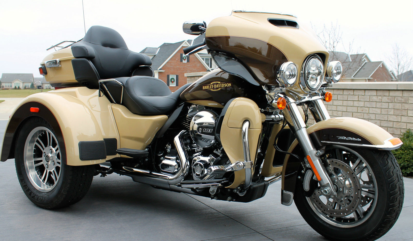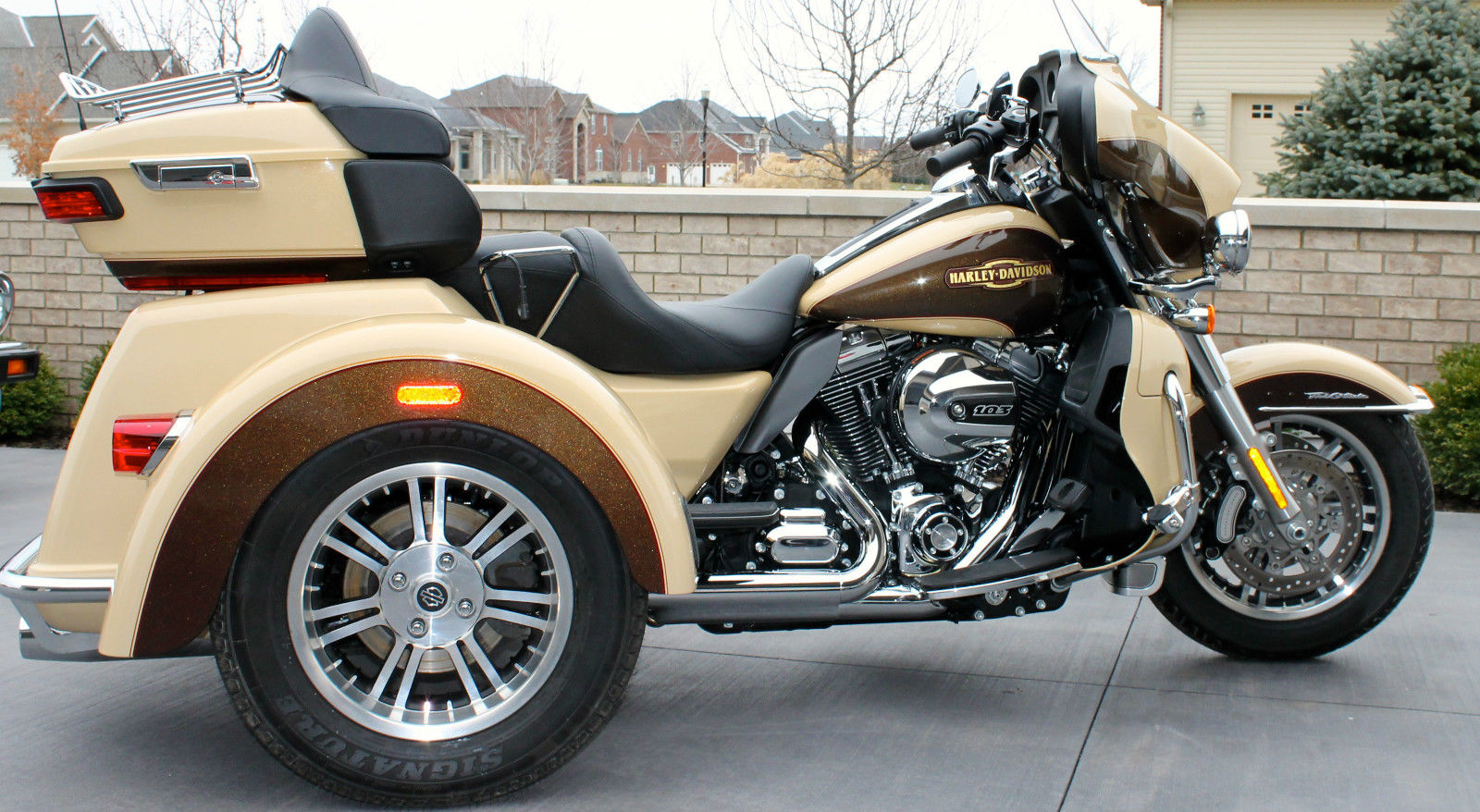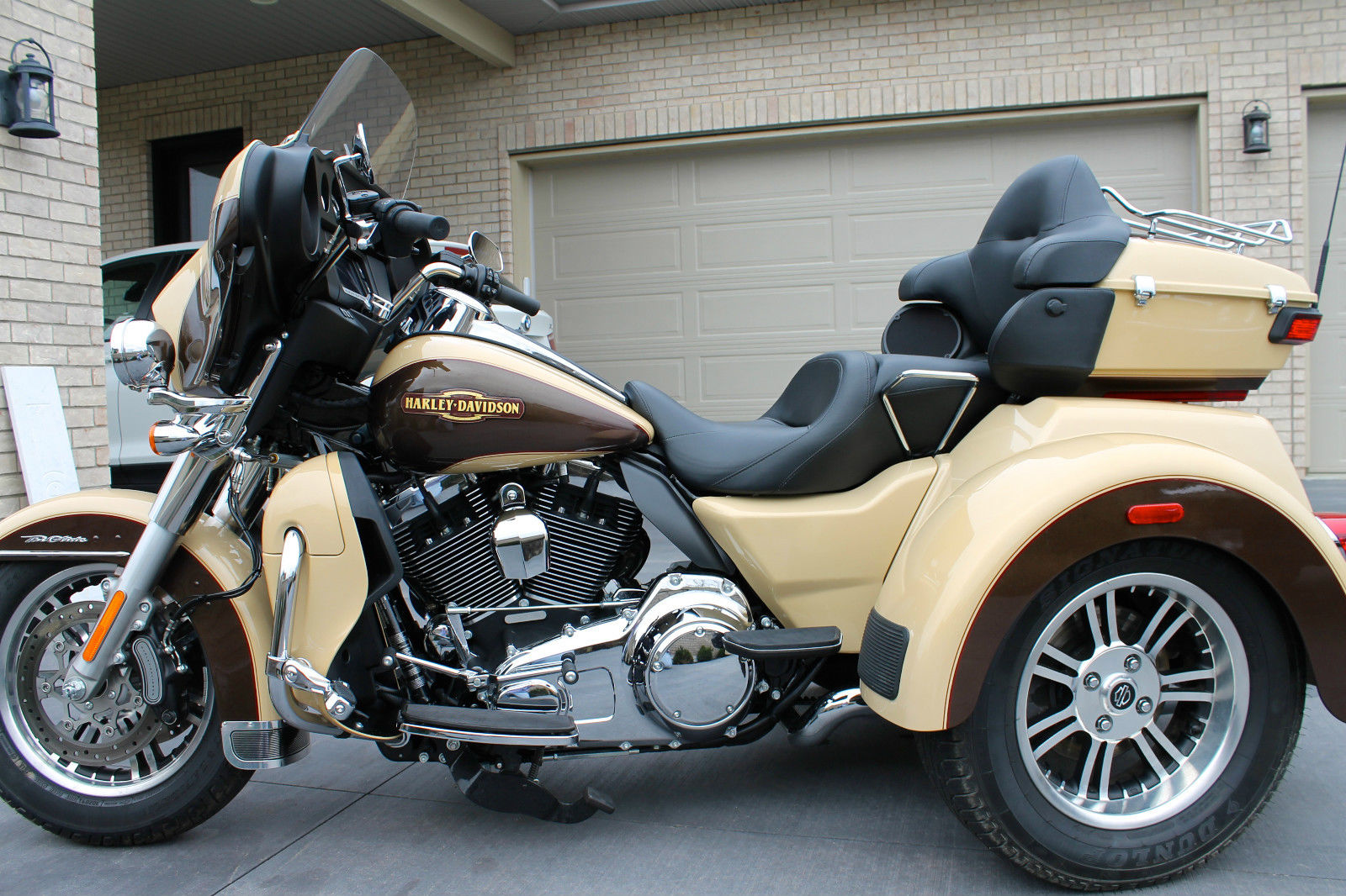 Old school brown color Trike Tri Glide Ultra with customized H-D parts.